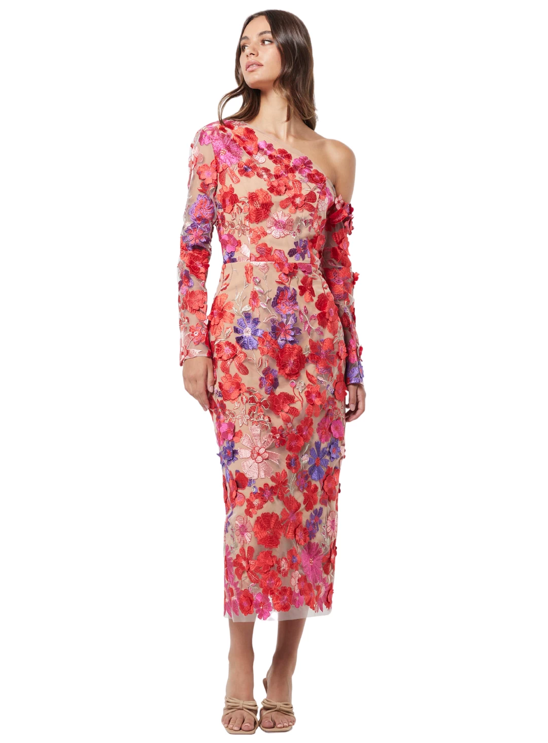 The Electric Dress is a gorgeous midi dress by Elliatt. Embellished with 3D flowers and contrasted nude lining, this stunning midi length dress features an asymmetric neckline and long sleeves.