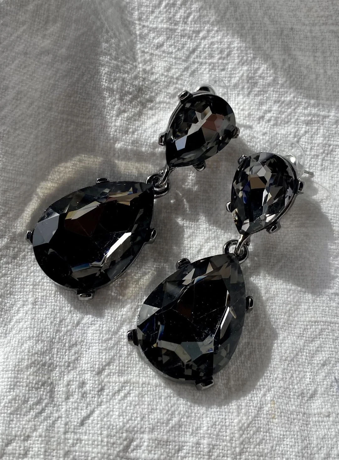 A gorgeous pair of earrings by Samibe. A statement piece featuring charcoal coloured gem stones.