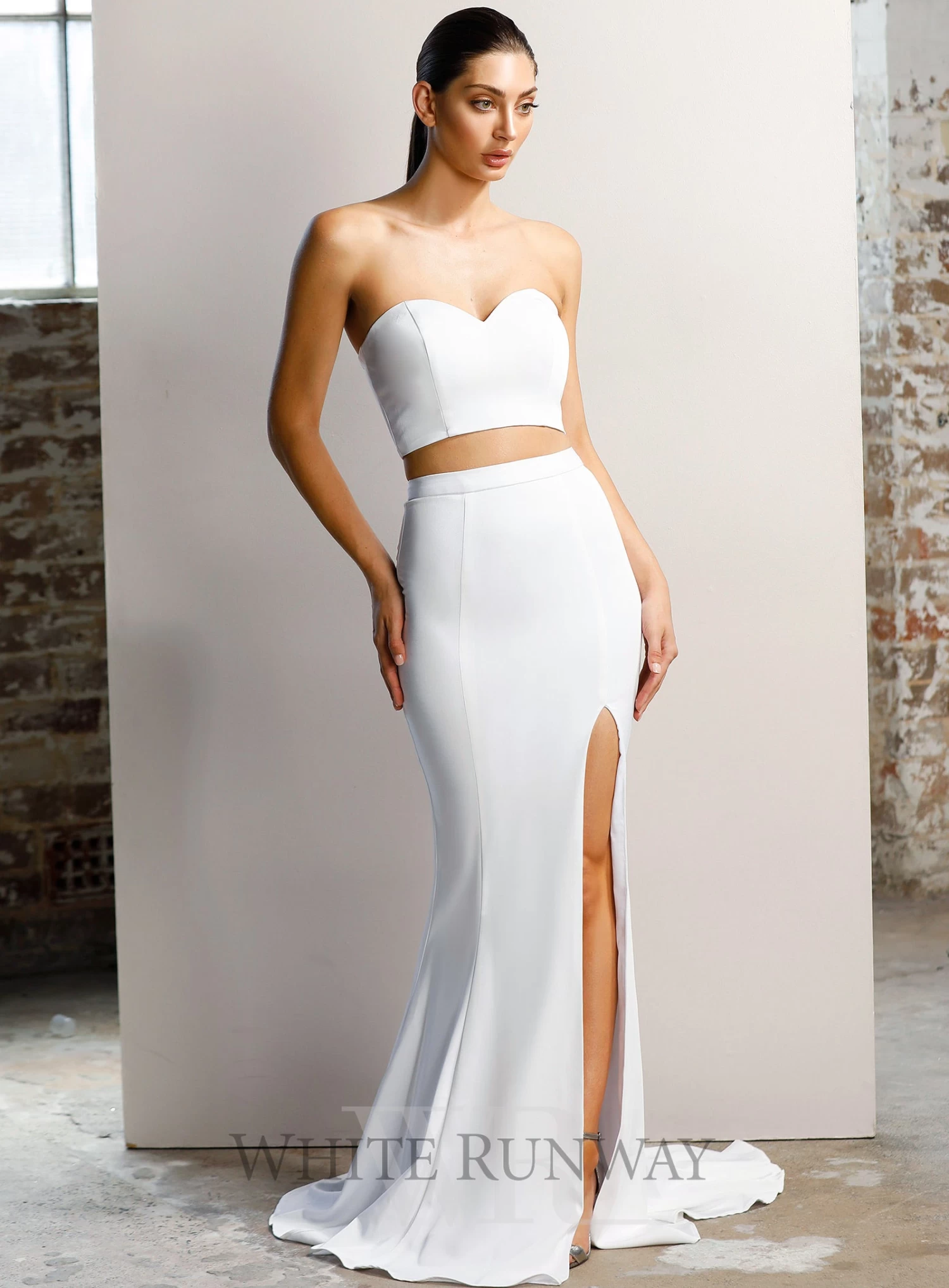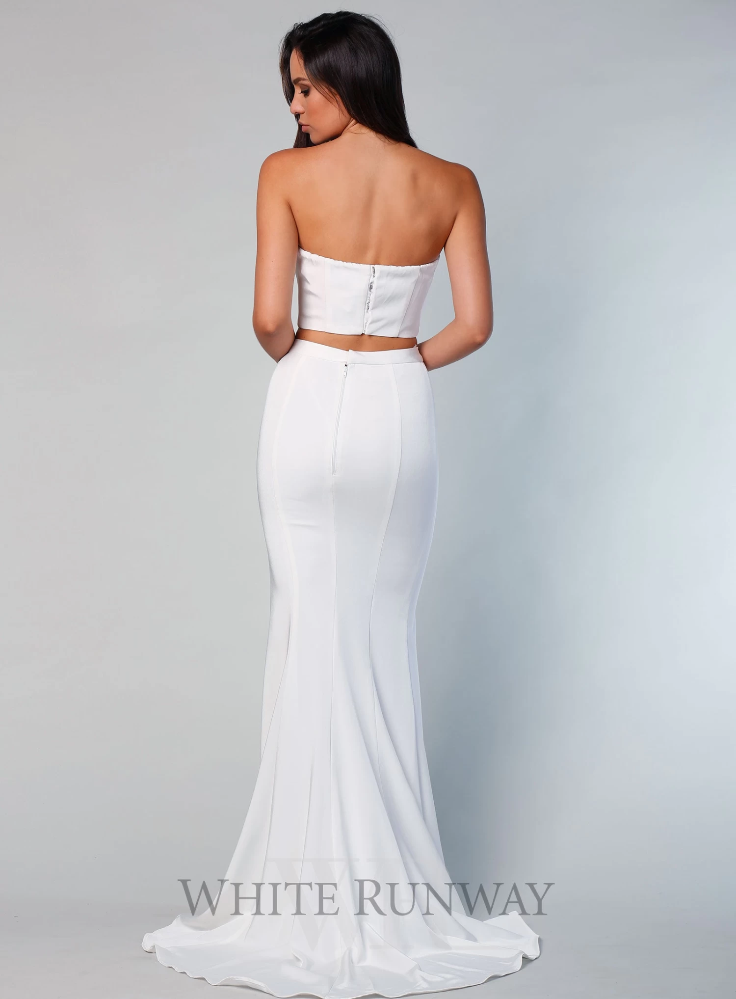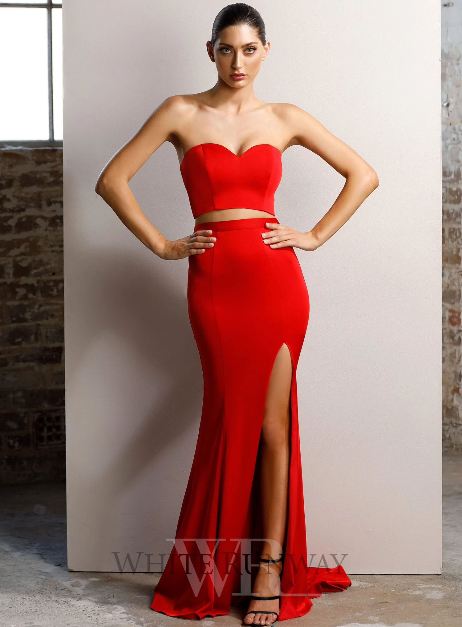 A gorgeous two piece set JX1001 by Jadore Evening. A strapless style featuring a leg split and floor sweeping train.
