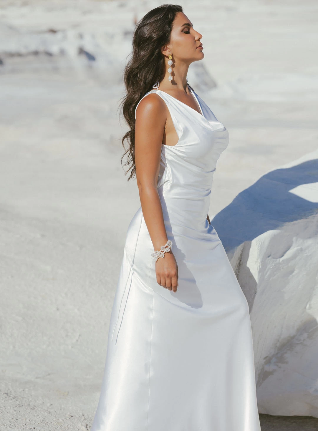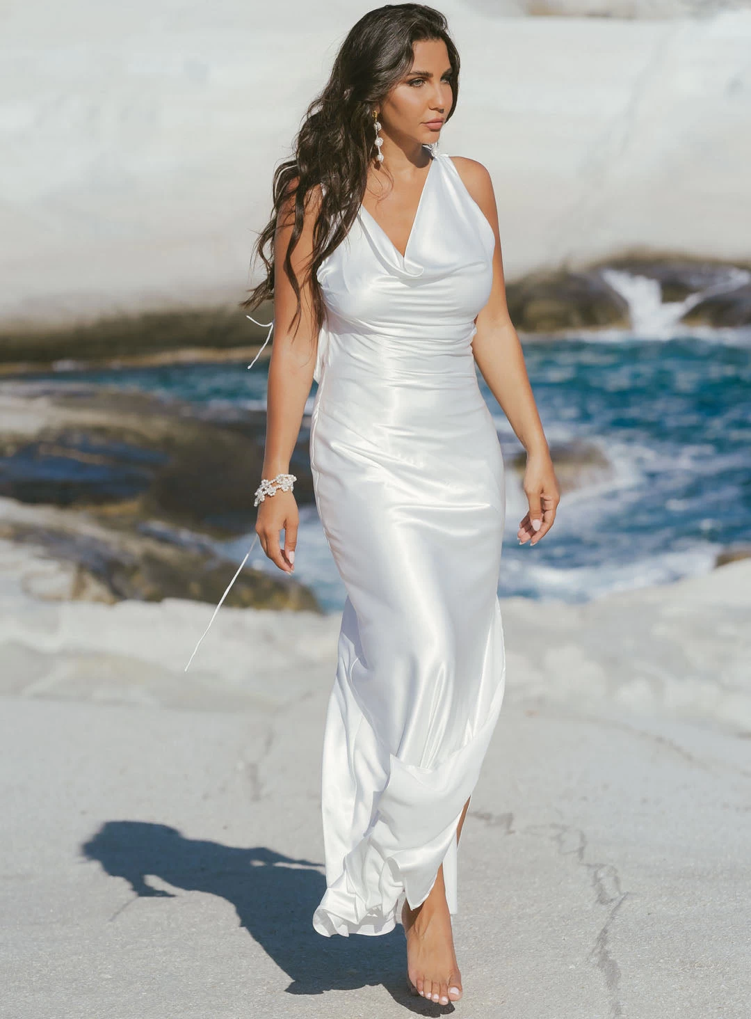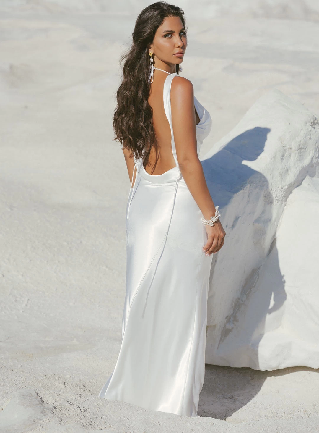 A stunning backless dress by Adri. Featuring a cowl neckline, a knee-length side split skirt and a drapey low back with two adjustable tie-ups.