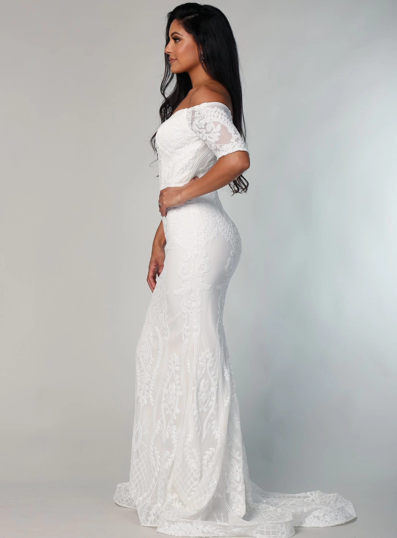 A gorgeous gown by Tina Holly. An off shoulder style featuring a sweetheart neckline, sheer elbow length sleeves and a stunning sequin pattern overlay throughout.