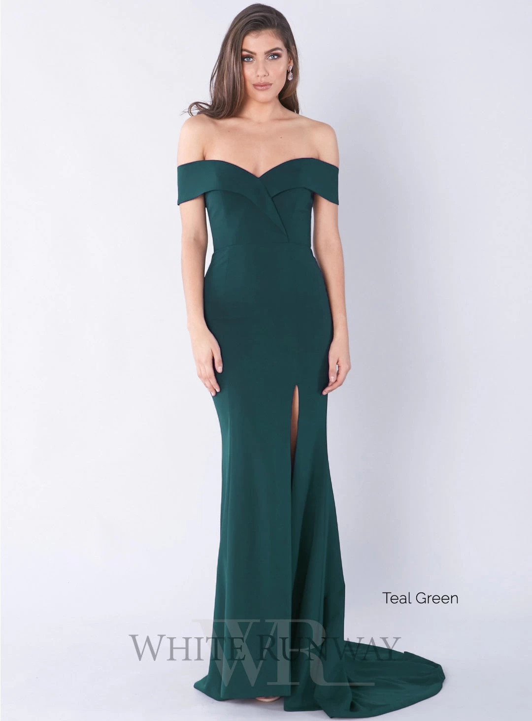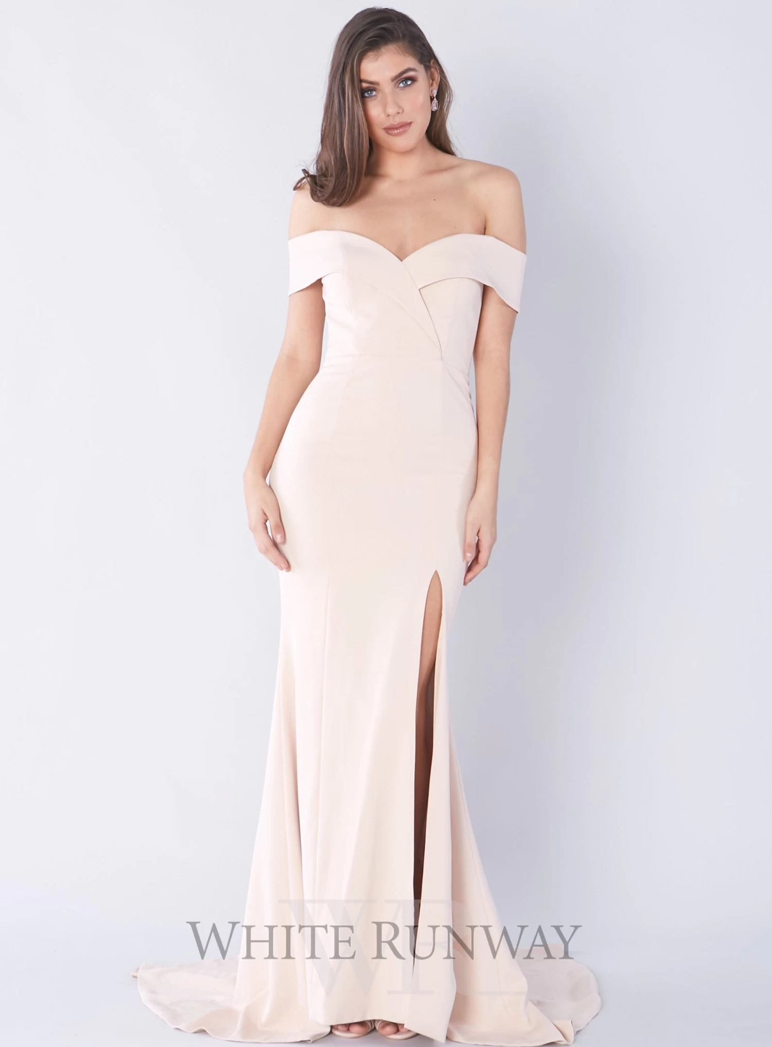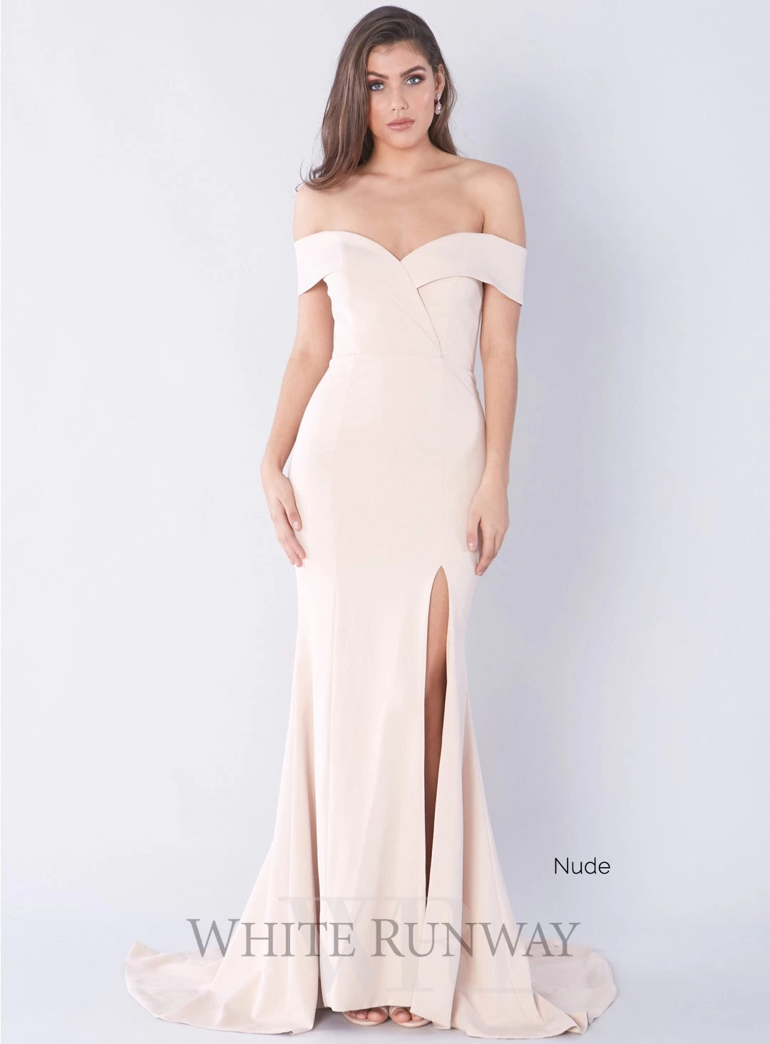 A stunning full length gown by Samantha Rose. An off shoulder style featuring crossover detailing on the bust and a side split in the skirt.