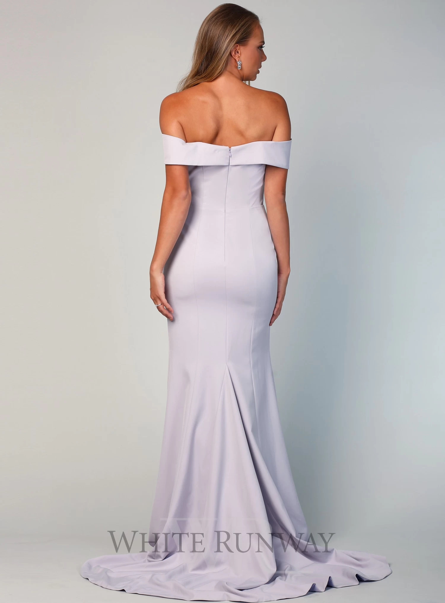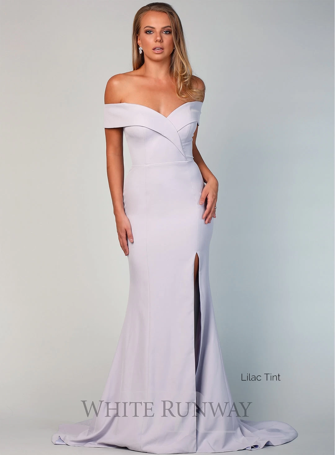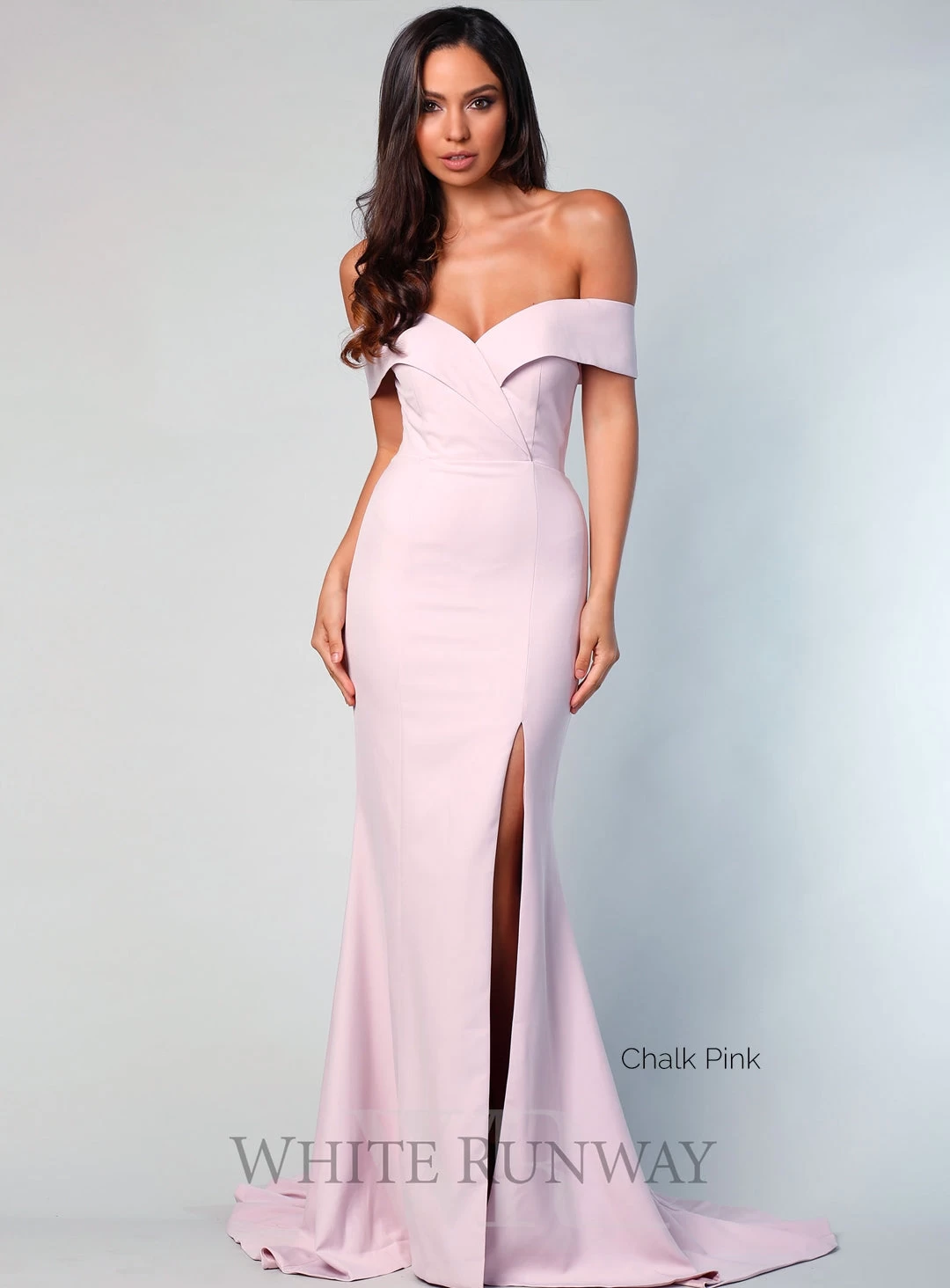 A stunning full length gown by Samantha Rose. An off shoulder style featuring crossover detailing on the bust and a side split in the skirt.