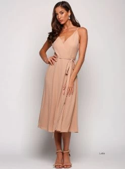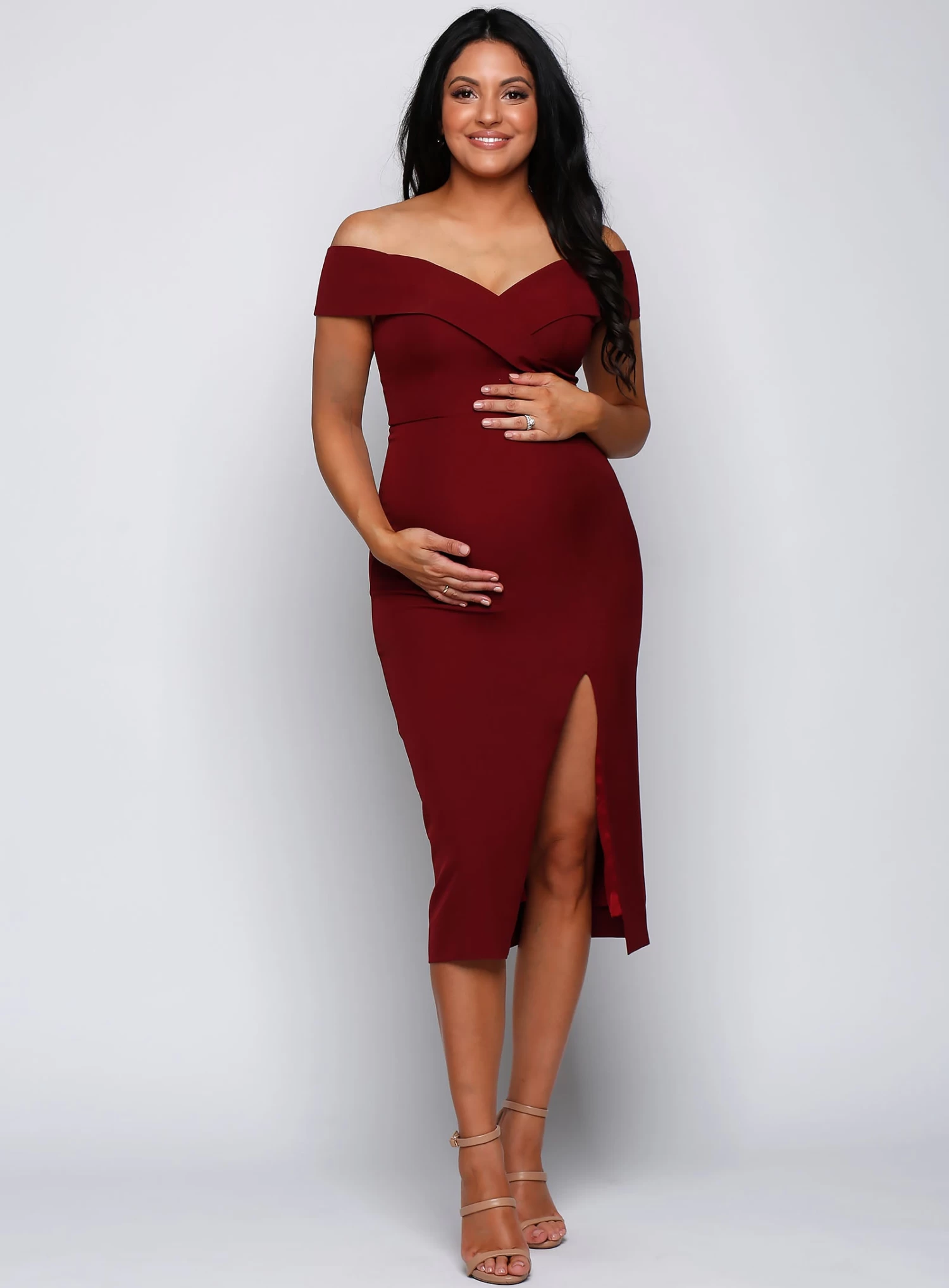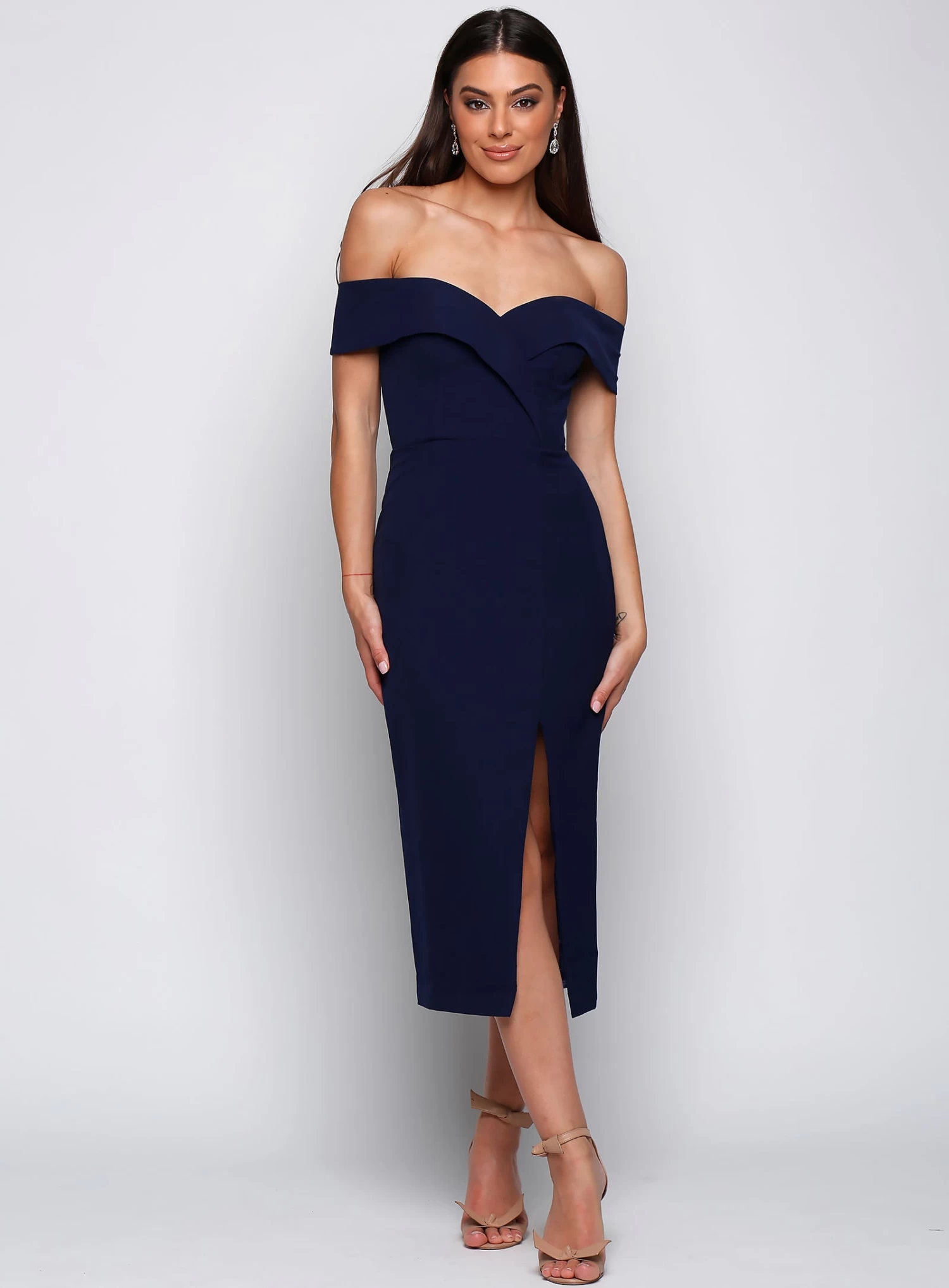 A beautiful midi by Samantha Rose. An off shoulder style featuring crossover detailing on the bust and a side split in the skirt.