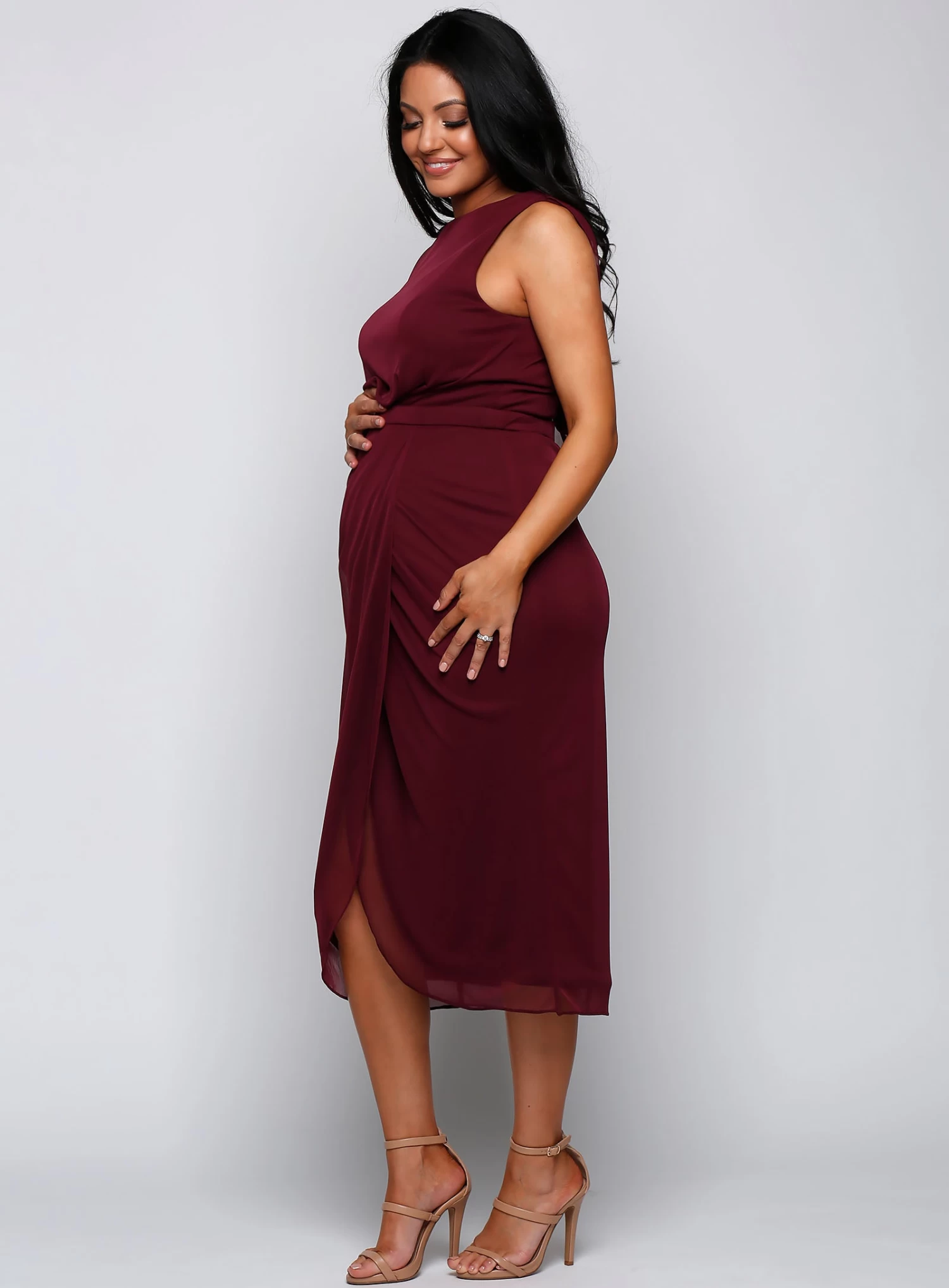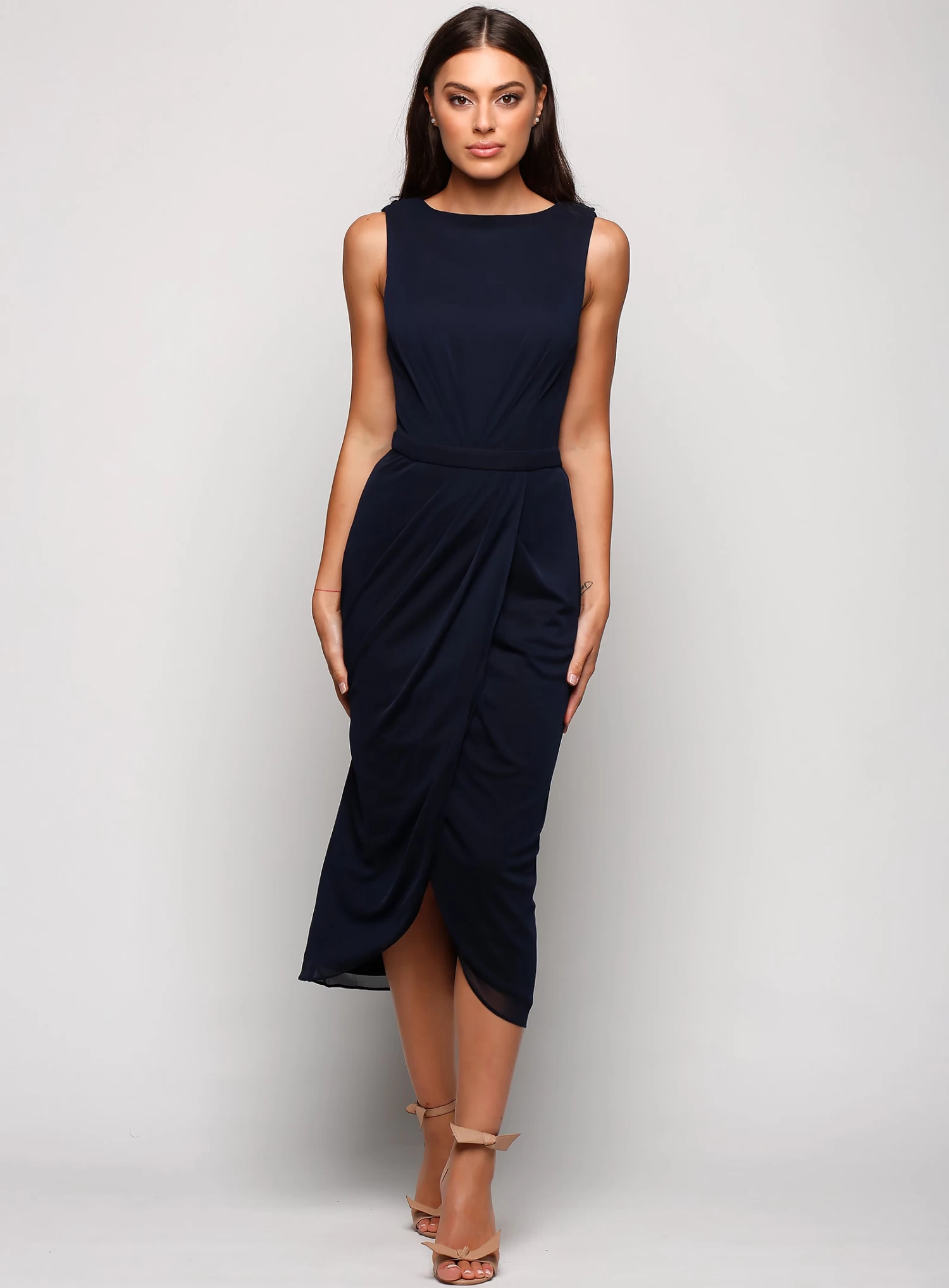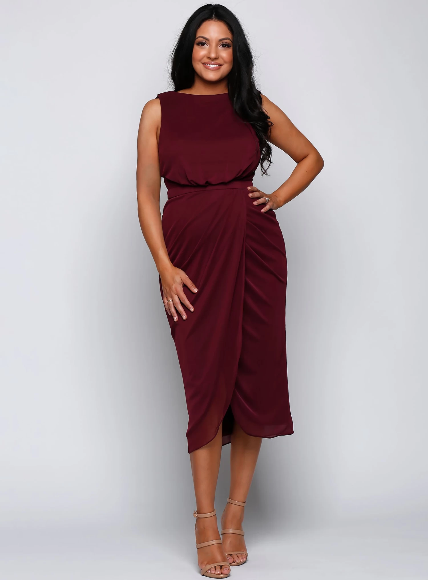 A gorgeous midi style by Samantha Rose. A high neck style featuring a wrap midi skirt and cowl back.