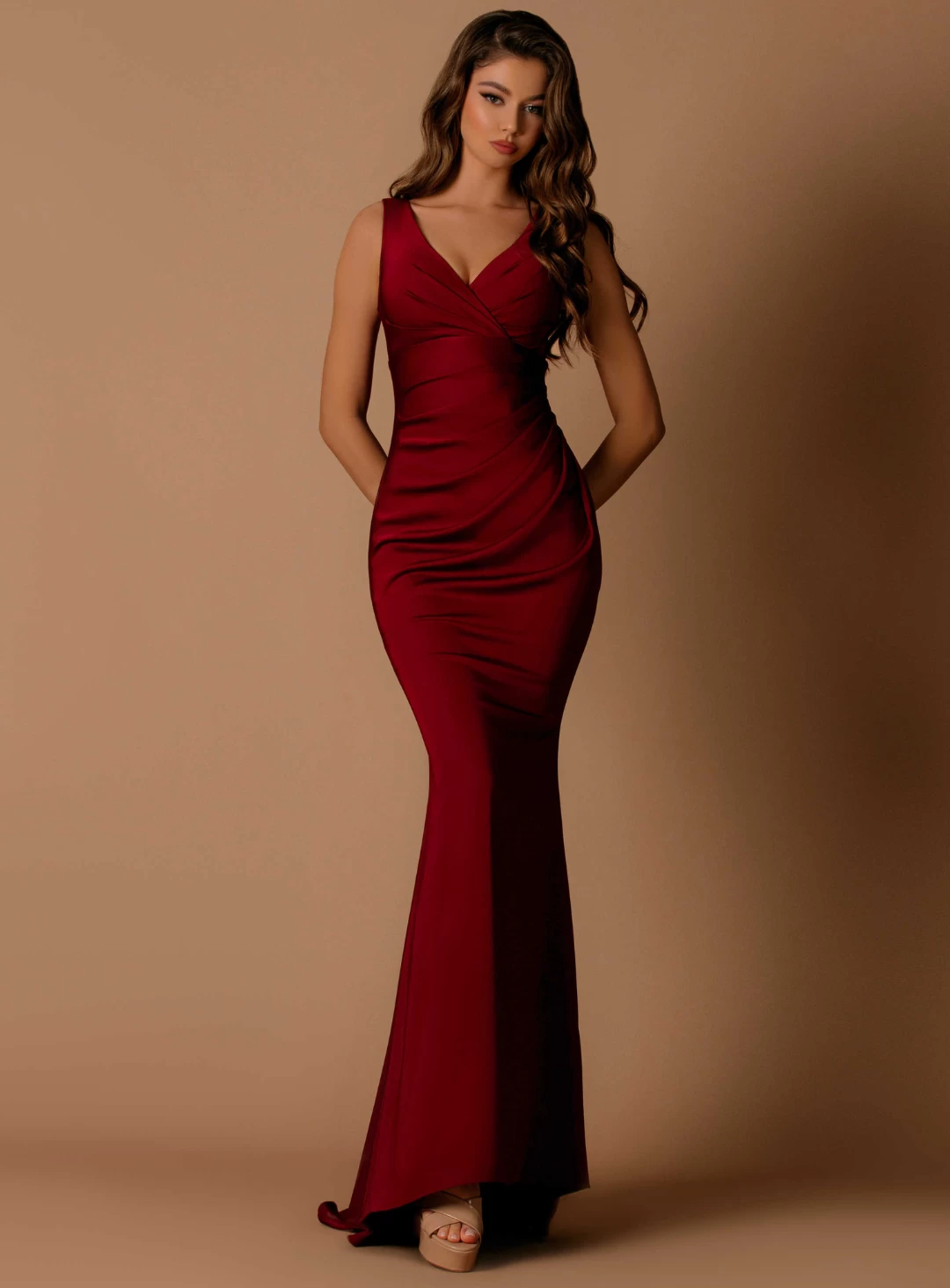 A stunning full length gown by Nicoletta NBM1010. A v-neck style featuring gathers throughout and a small sweeping train.