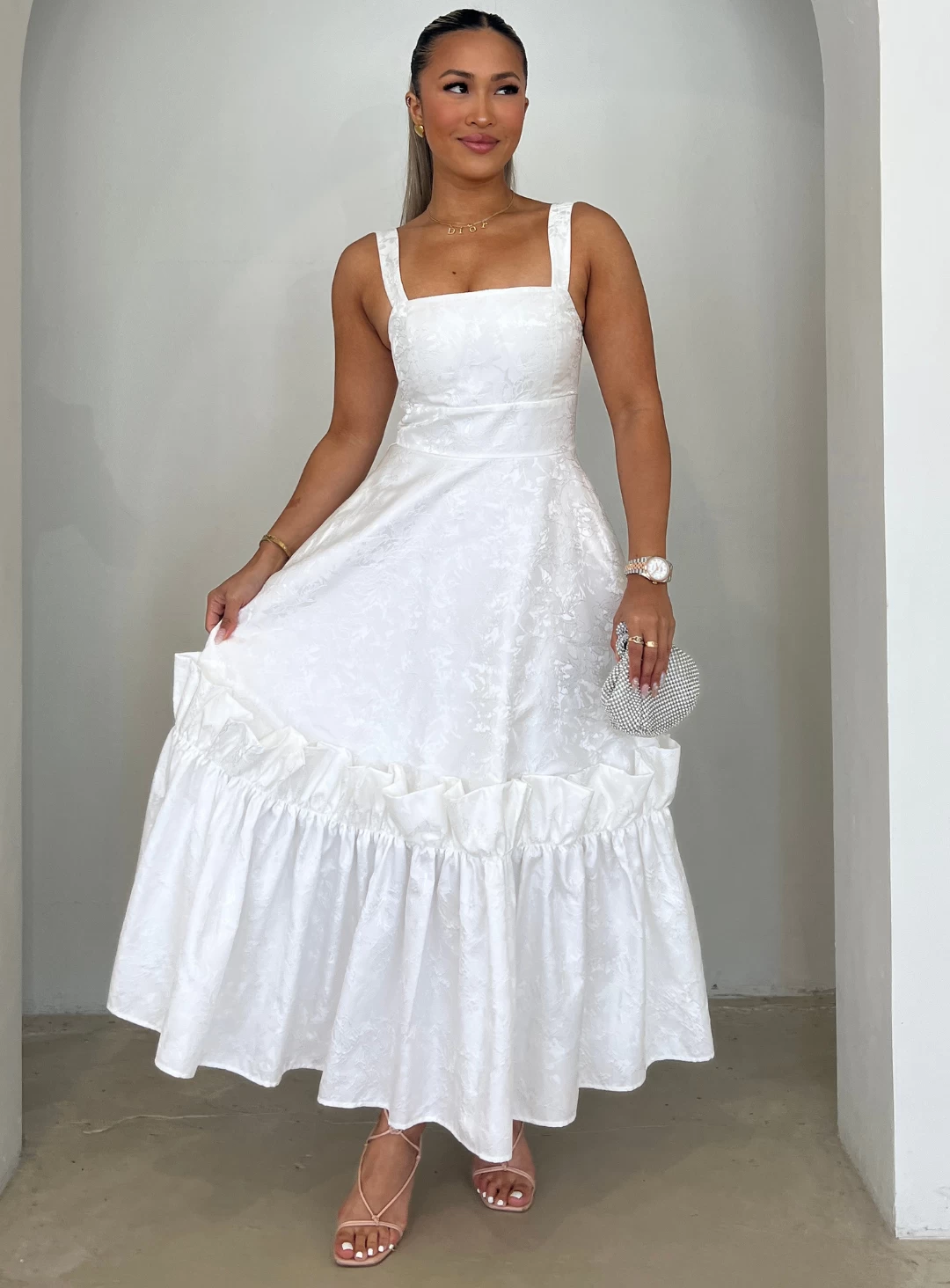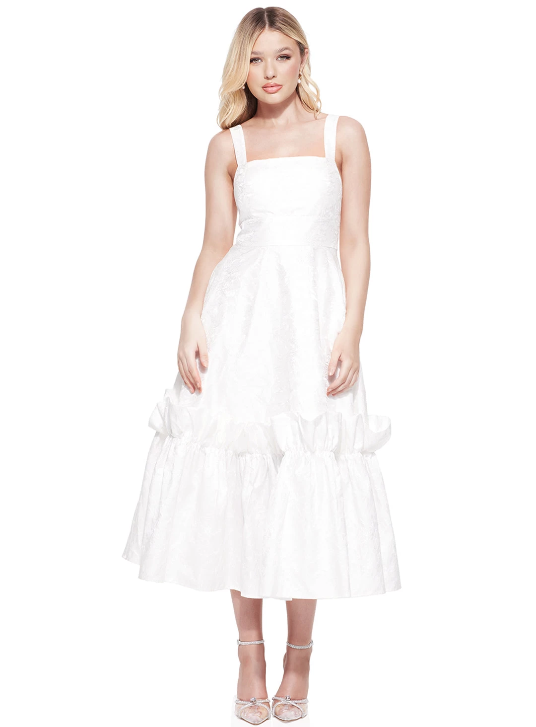 A stunning midi dress by Australian designer Samantha Rose. A unique design featuring a thick waistband, thick straps and a tiered midi skirt.