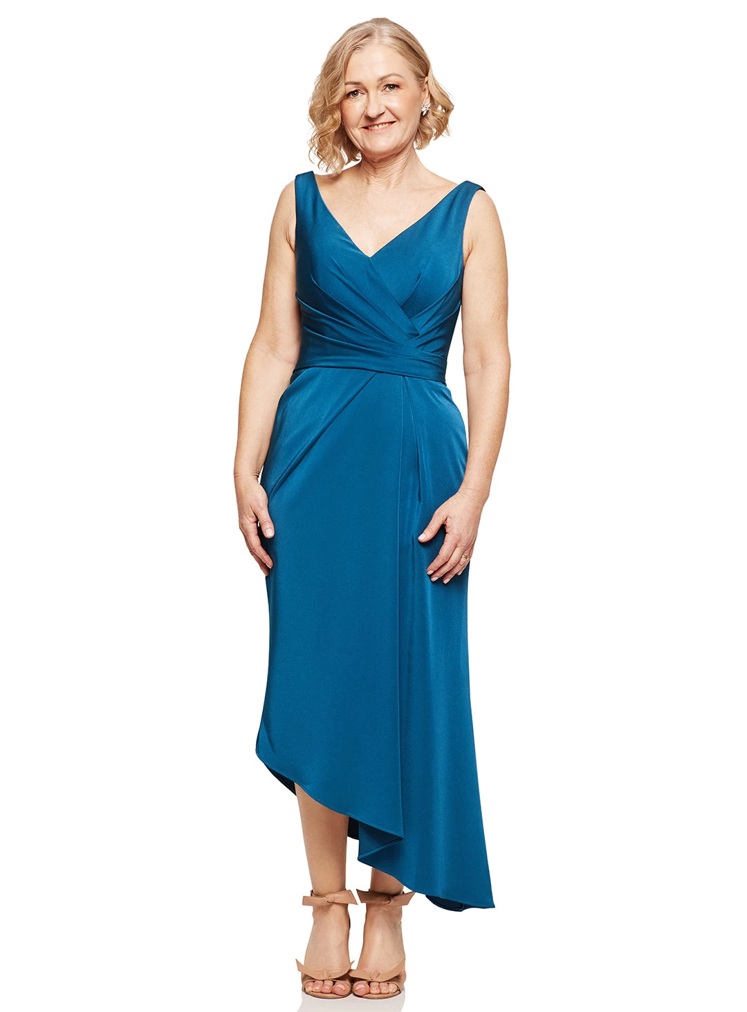 A stunning cocktail dress by Jadore Evening JX5013. A v-neck style featuring wide sleeves, softly ruched bodice and draped asymetric skirt.