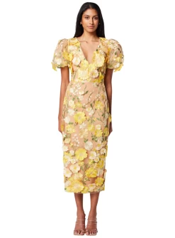 The Indie Dress is a stunning midi length dress by Elliatt. With Elliatt’s signature shape, this dress features a v-neckline, short puffed sleeves and a 3D embroidered floral fabric.