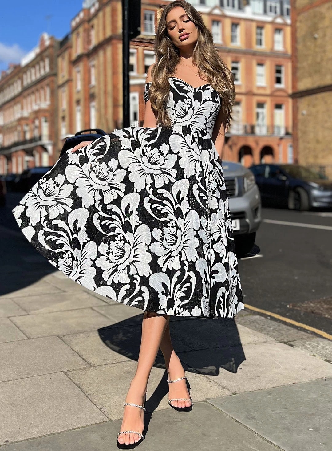 A stunning midi dress by Jadore JX6002. This off shoulder design features an sheer lace overlay and a-line skirt.