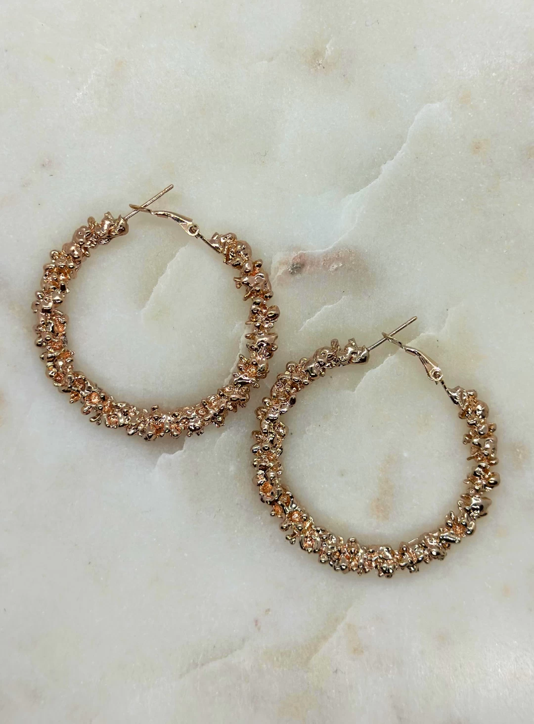 A stunning pair of textured hoop earrings featuring a hinge clasp. A modern take on the classic rose gold hoop.