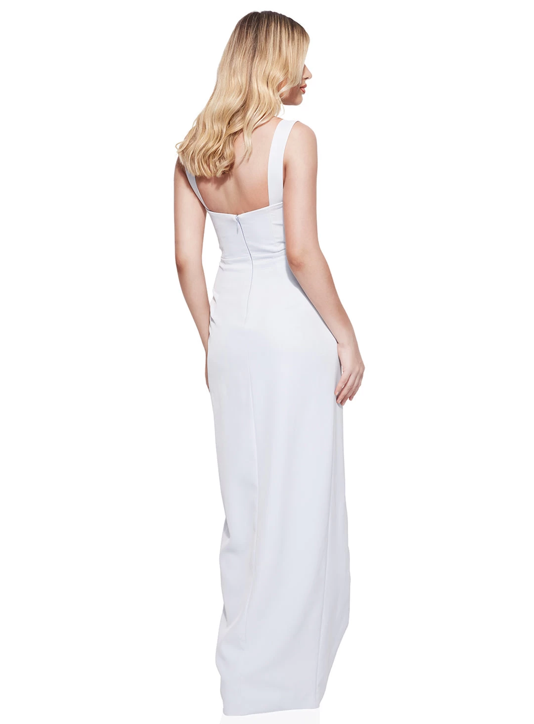 A gorgeous pencil dress by Samantha Rose. A flattering design featuring ruching across the bust and skirt, thick straps and a wrap style skirt.