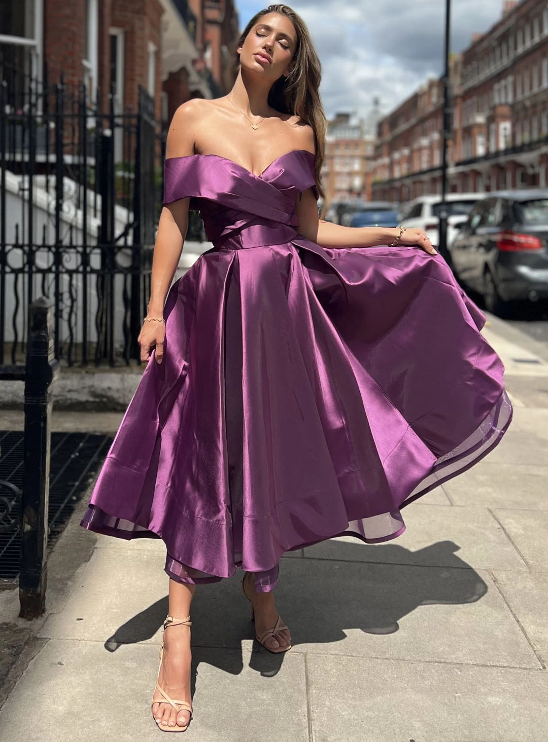A beautiful midi length dress by Jadore Evening JX6026. An off shoulder style featuring a cross bodice and flared pleated skirt.