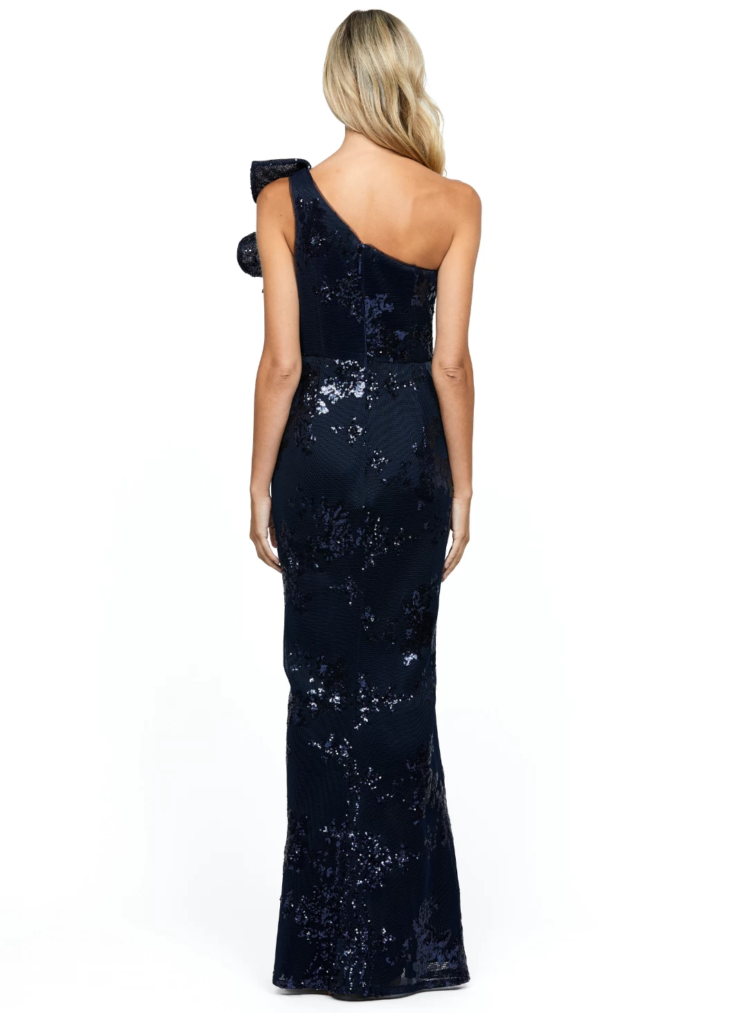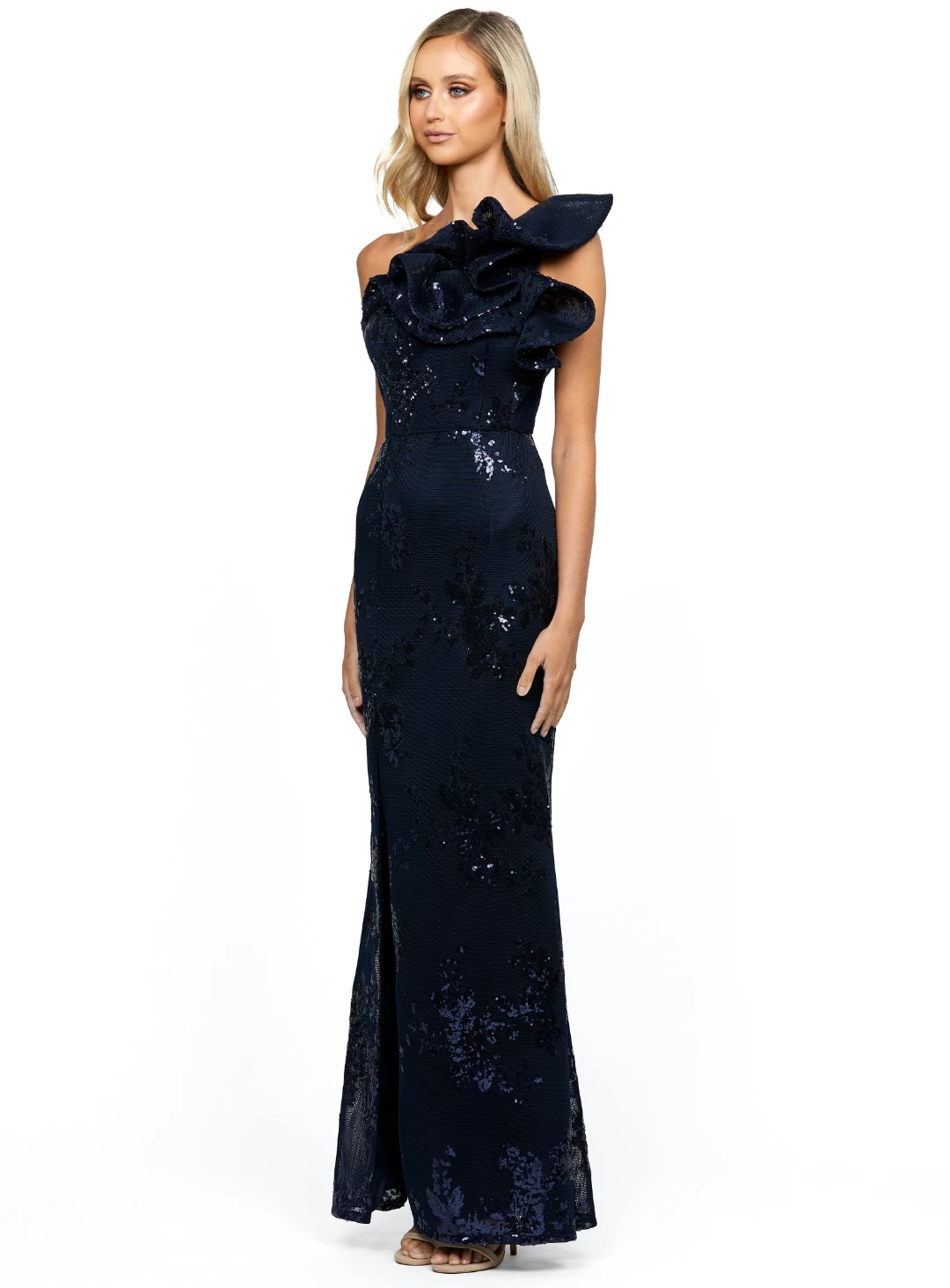 A gorgeous gown by Bariano. This one shoulder style features a bold ruffle, mesh sequin fabric and a thigh high split.