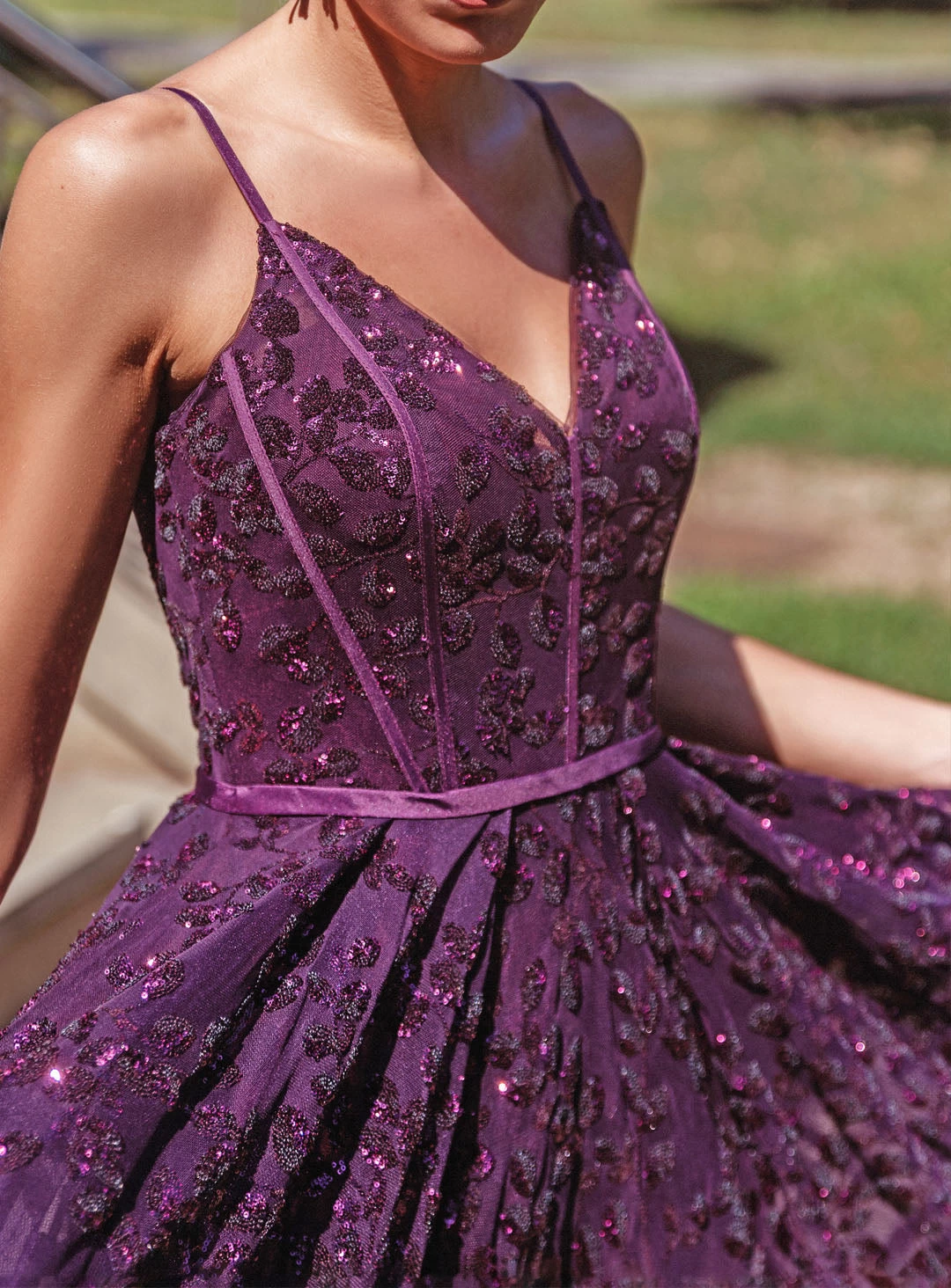 A stunning cocktail dress by Tina Holly. A v-neck style featuring a floral sequin pattern, boned bodice and a full skirt.