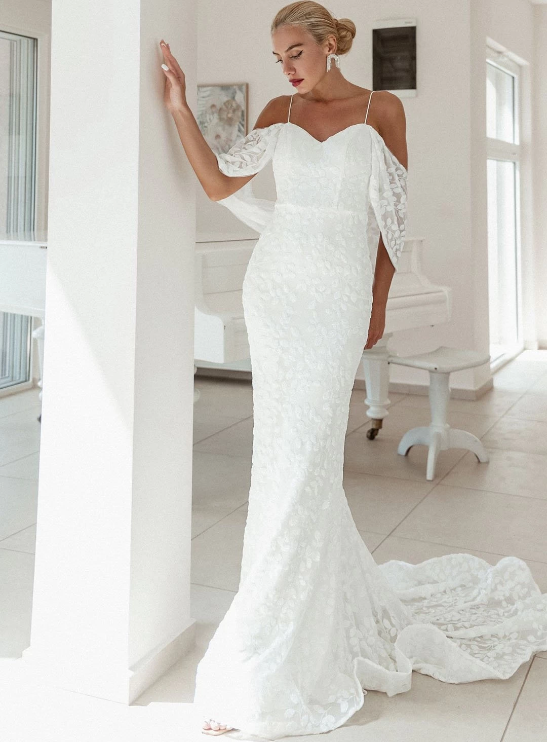 A gorgeous gown by Tina Holly. A sequin patterned gown featuring a sweetheart neckline and draped overlay on the arms.