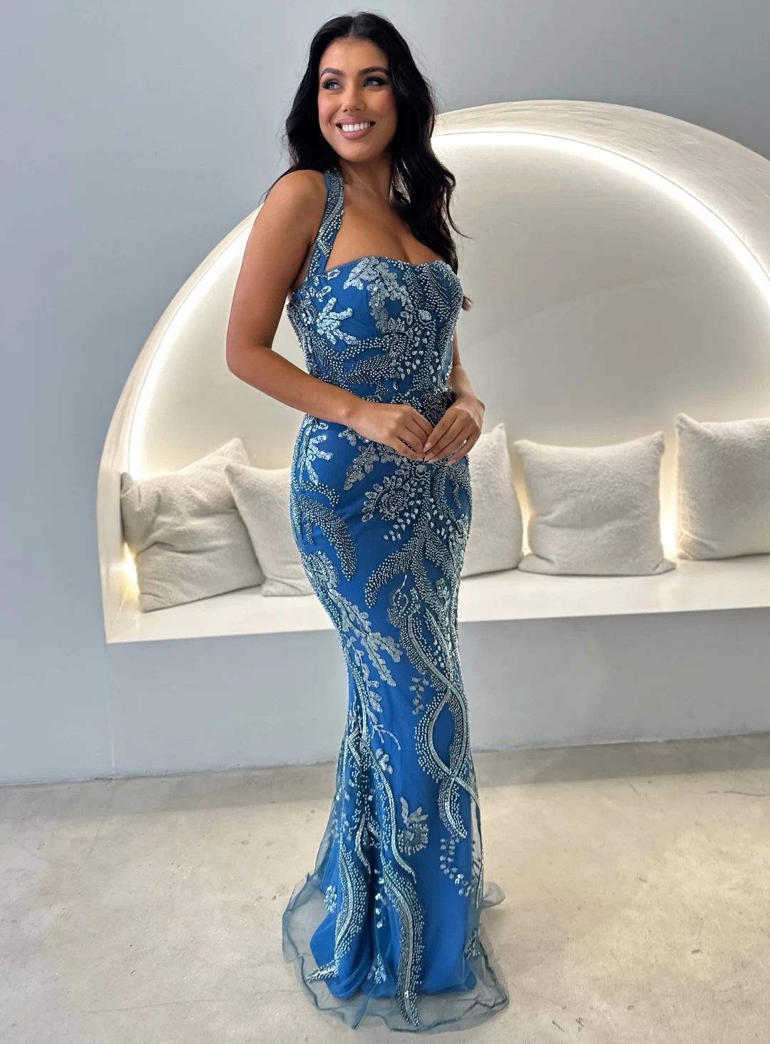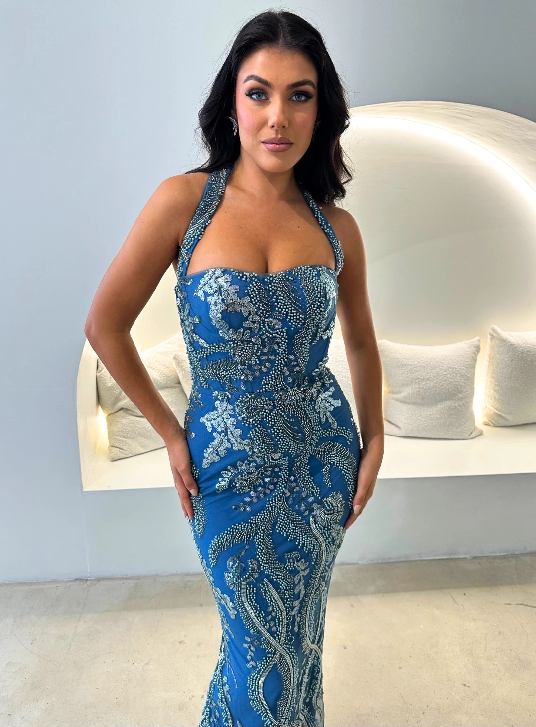 A gorgeous full length dress by Nicoletta Luxe range LUX013. A stunning silhouette with intricate bead work, halter straps and mermaid style skirt.