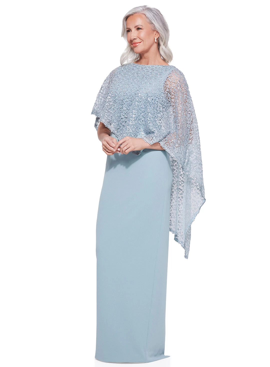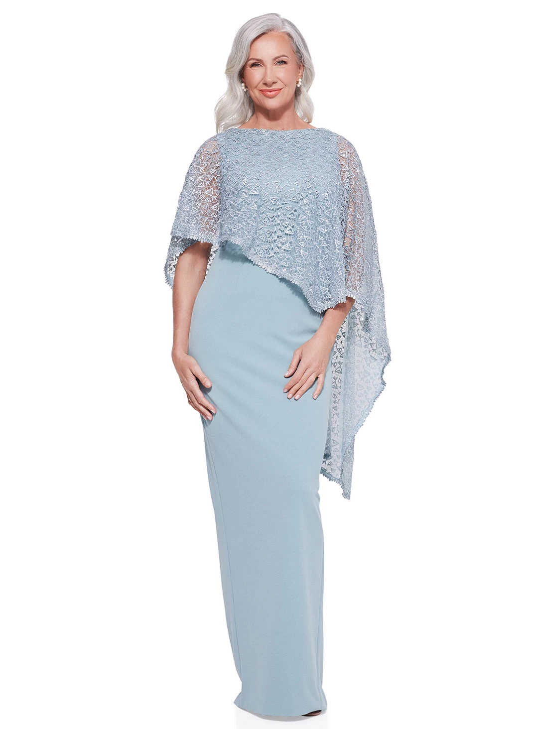 A gorgeous full length dress by Trellis Lane. A maxi style featuring a sequin lace overlay. Main dress is crafted from a stretchy textured crepe fabric.