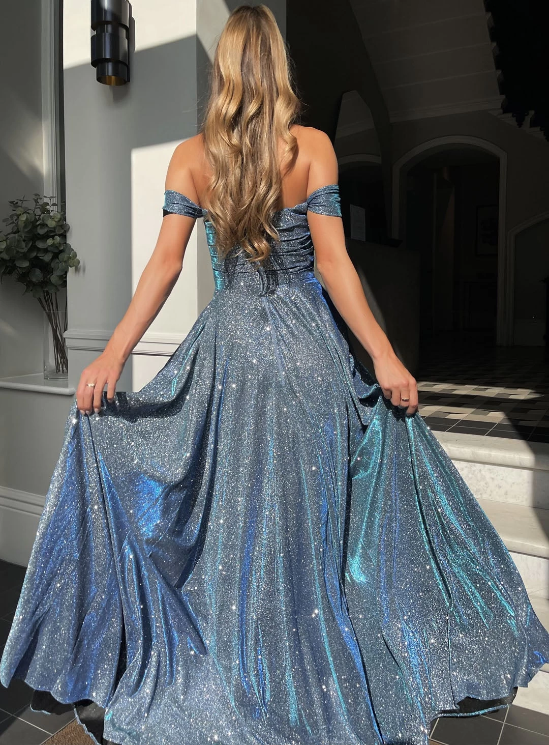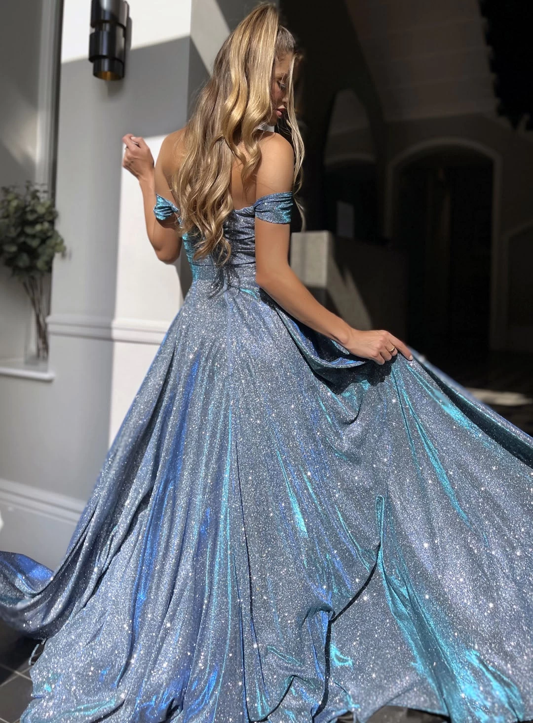 A stunning full length gown by Jadore JP127. An off shoulder style featuring a fitted bodice, flared skirt and thigh high split.