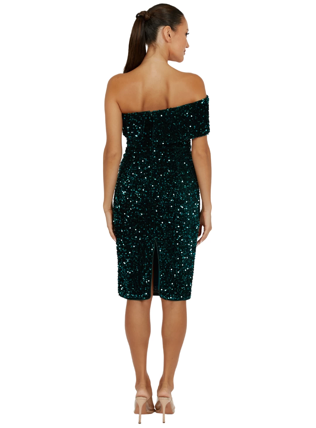 A stunning midi dress by Australian designer Samantha Rose. Crafted from a luxurious velvet sequin and featuring one off shoulder detail.