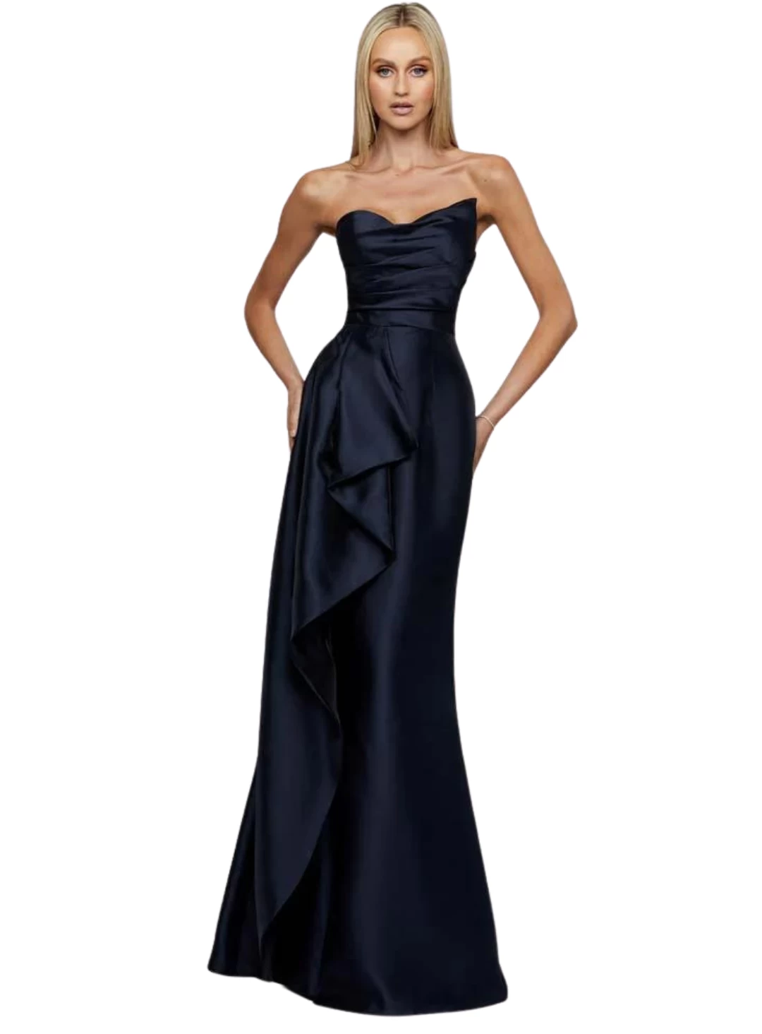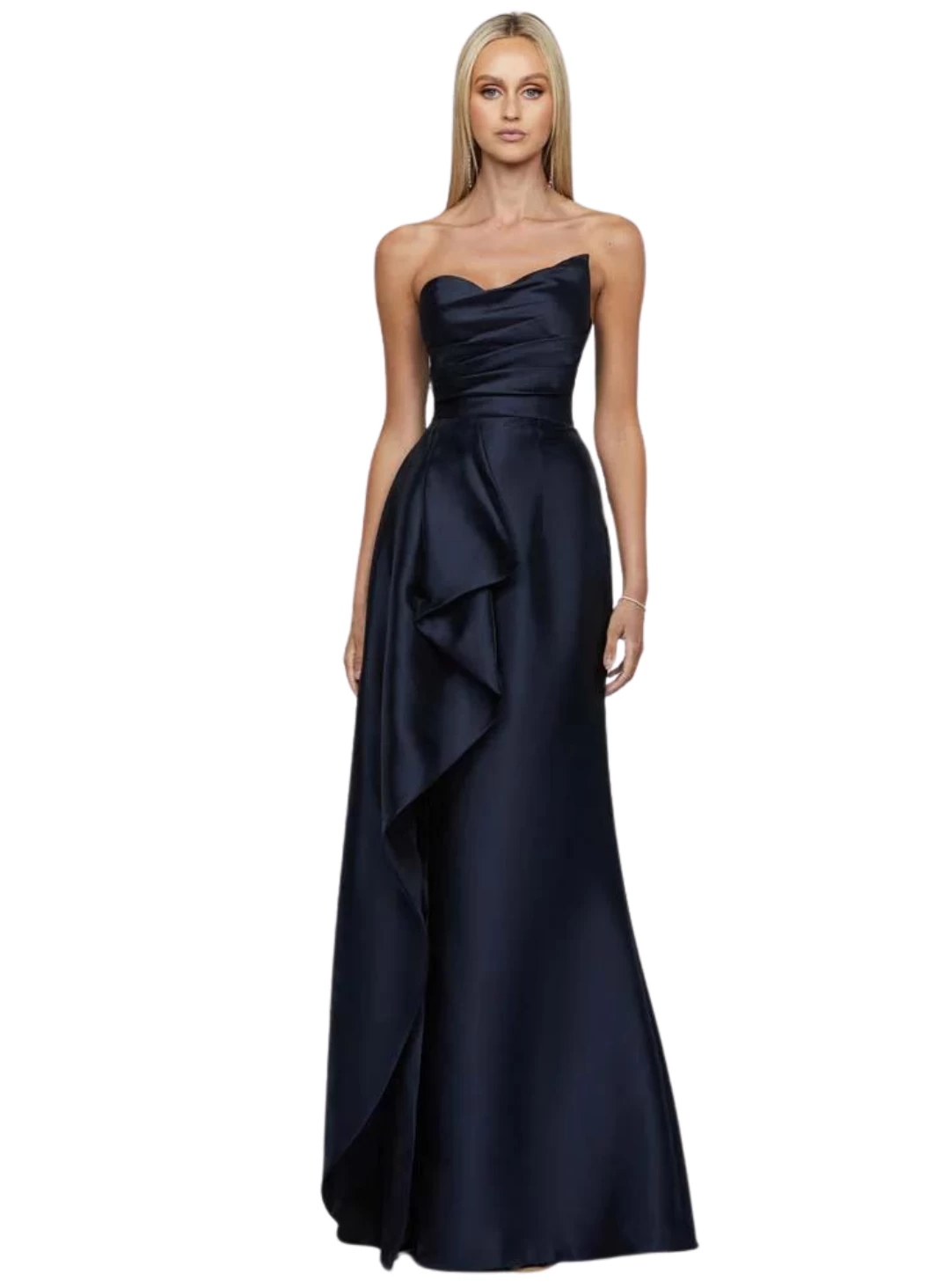 The Kasery Gown is a stunning full-length dress by Bariano. A ball gown style featuring a deep v neck with an intricate ruffle design on shoulder.