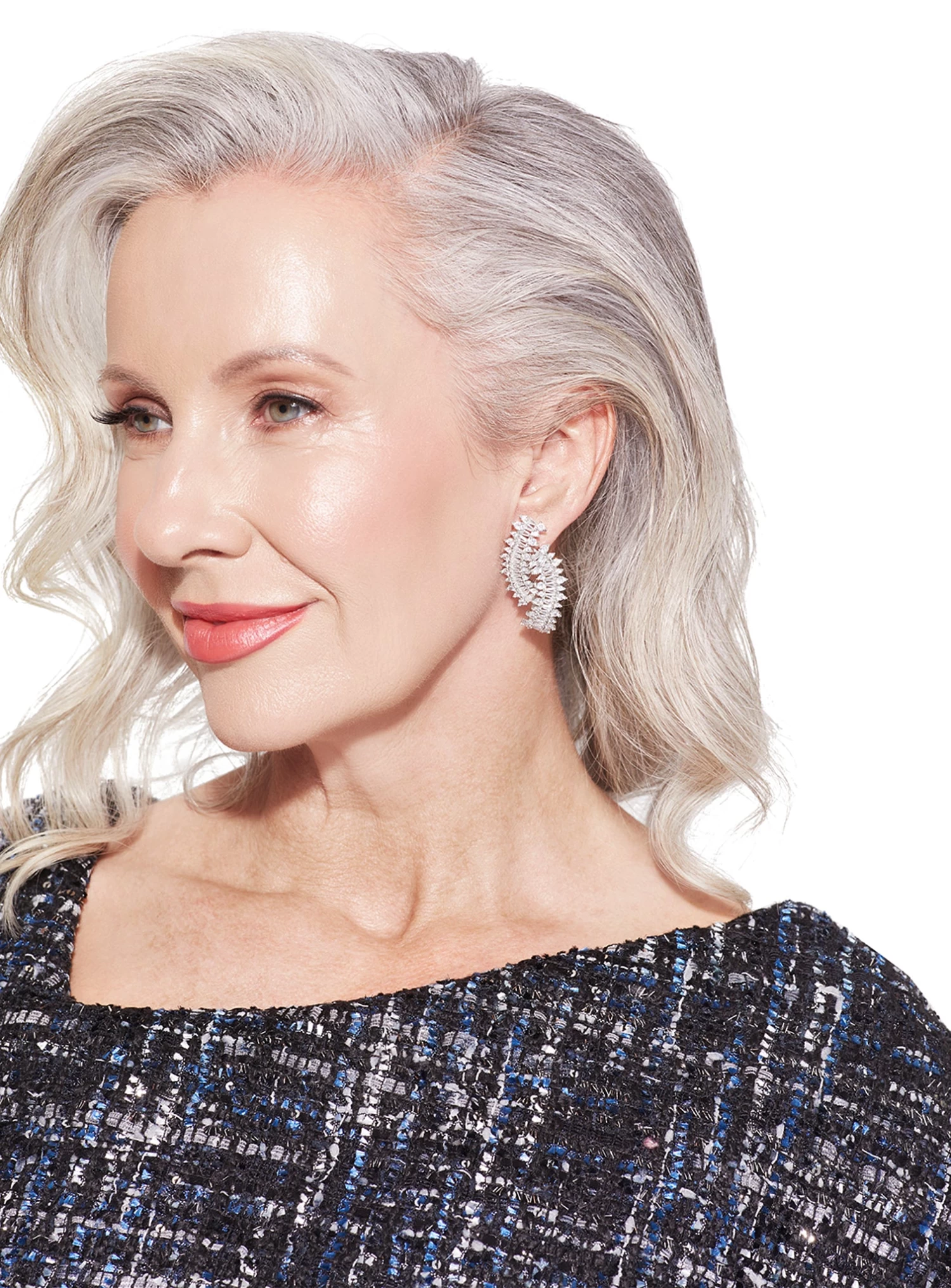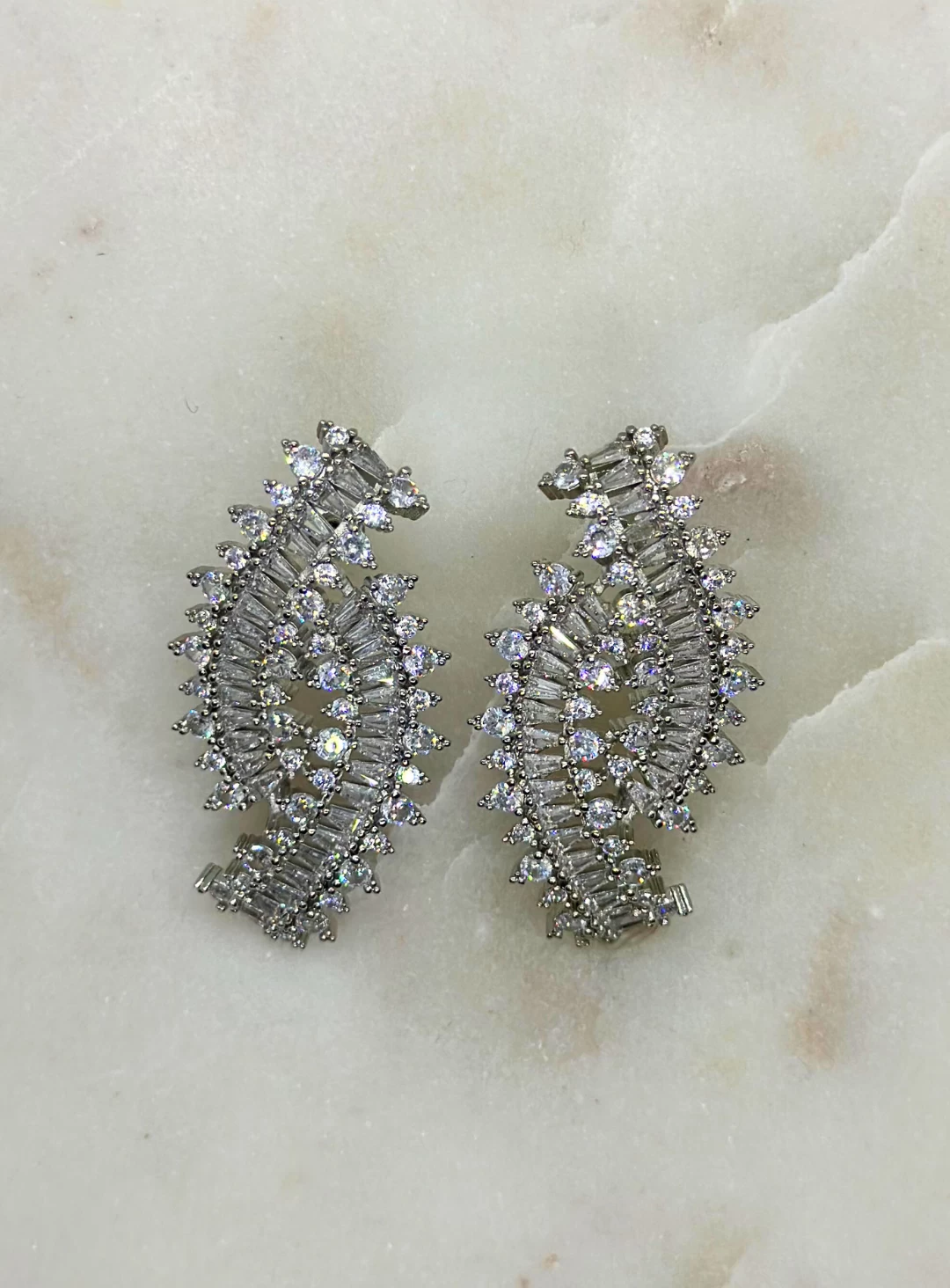 A luxurious pair of Curbic Zirconia asymmetrical studs with a curved design. A statement piece perfect for day or night.