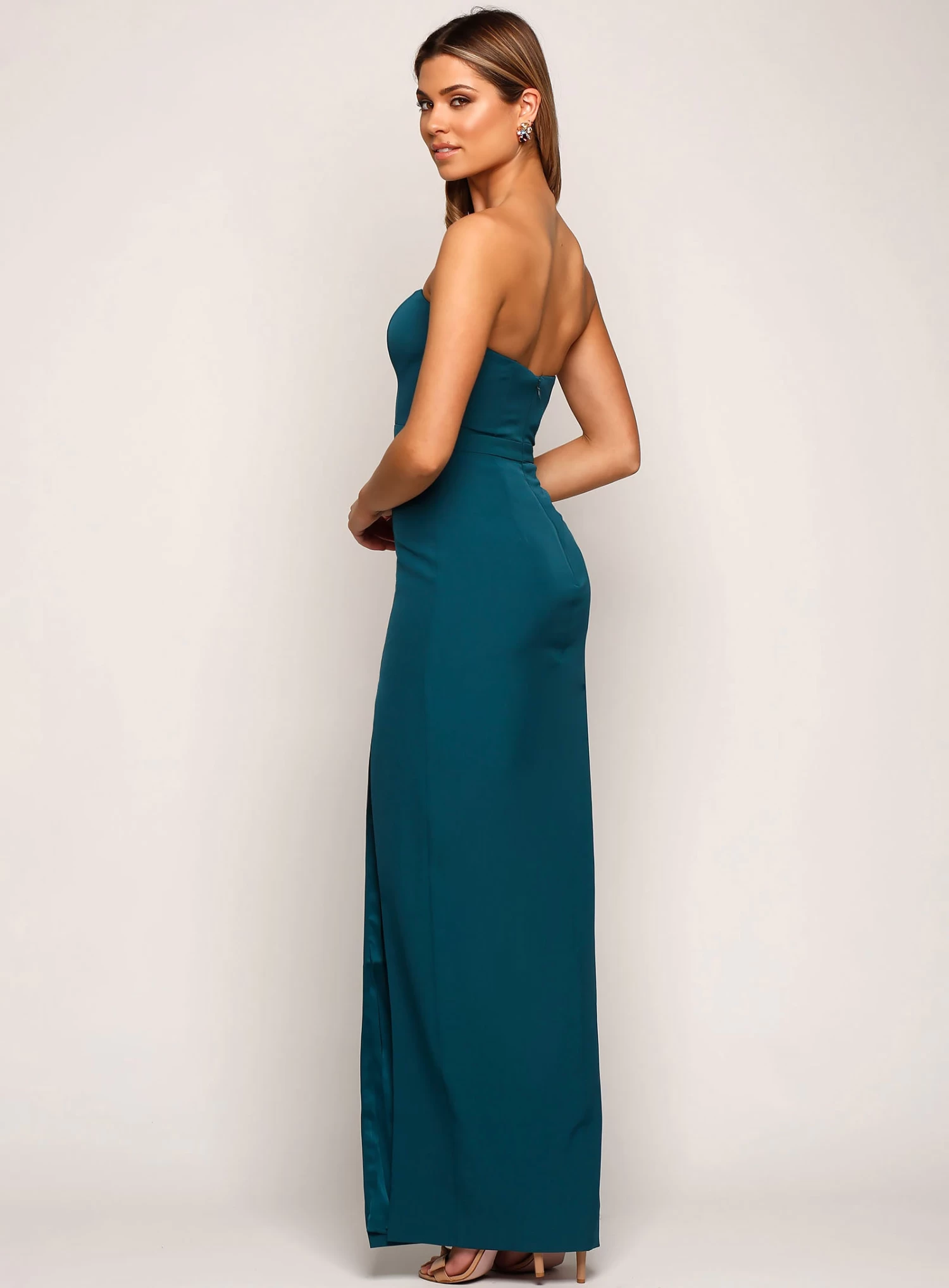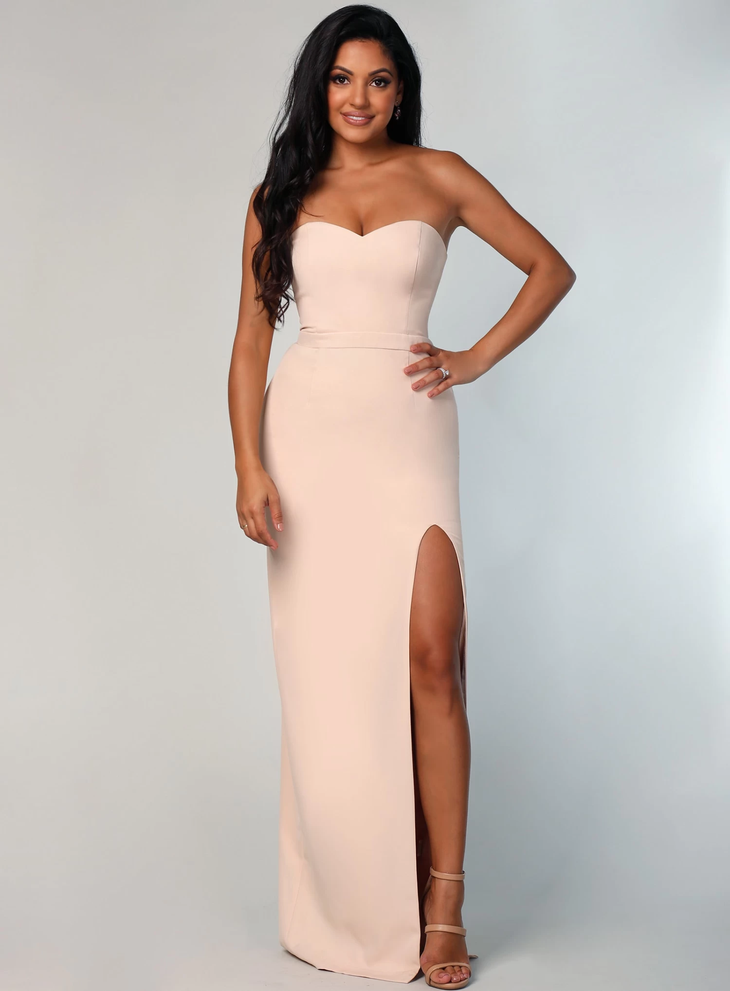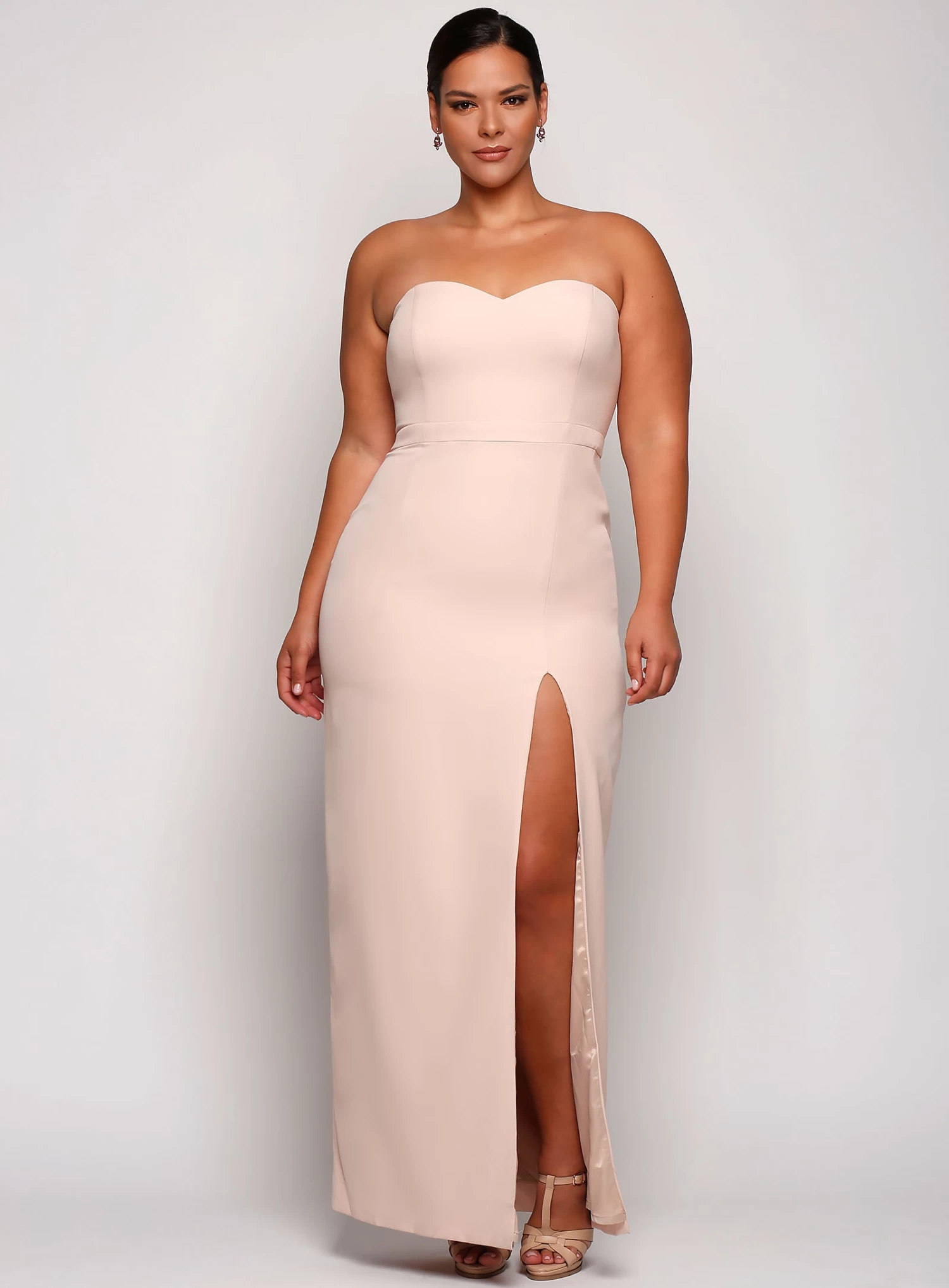 A gorgeous full length dress by Samantha Rose. A sweetheart neckline style featuring a straight pencil skirt and thigh high side split.
