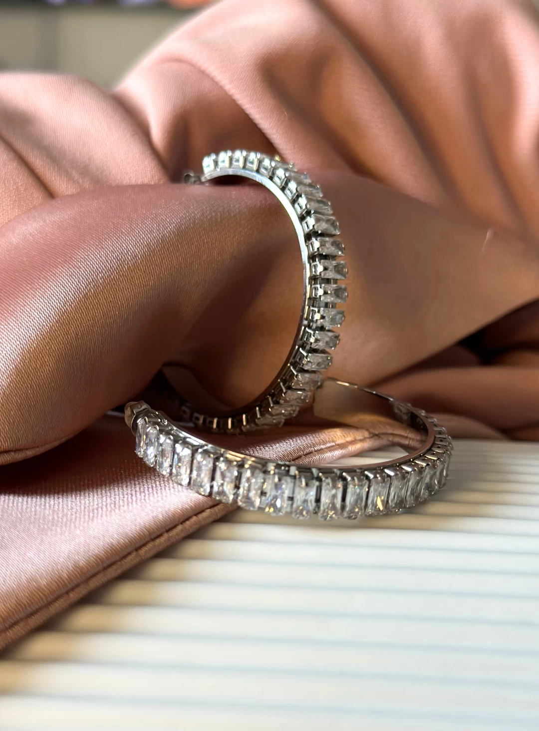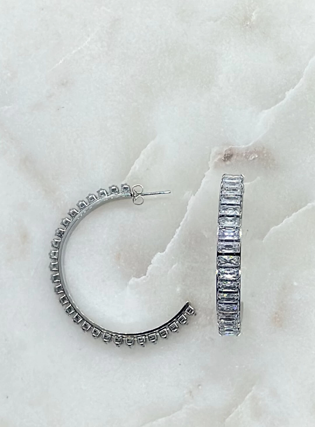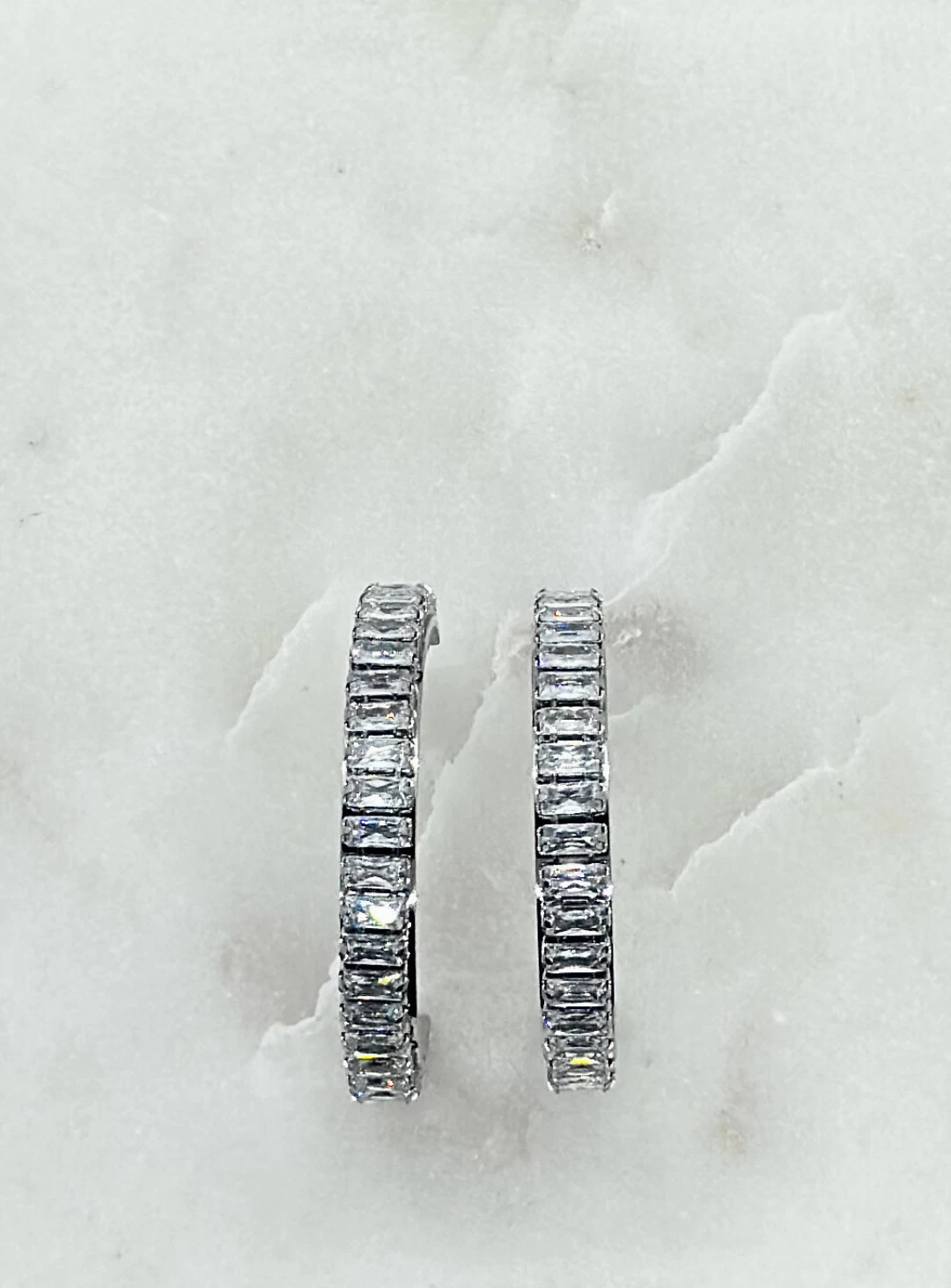 A gorgeous pair of silver hoops lined with Cubic Zirconia crystals and a butterfly closure. A simple but elegant pair of earrings that will go with any outfit.