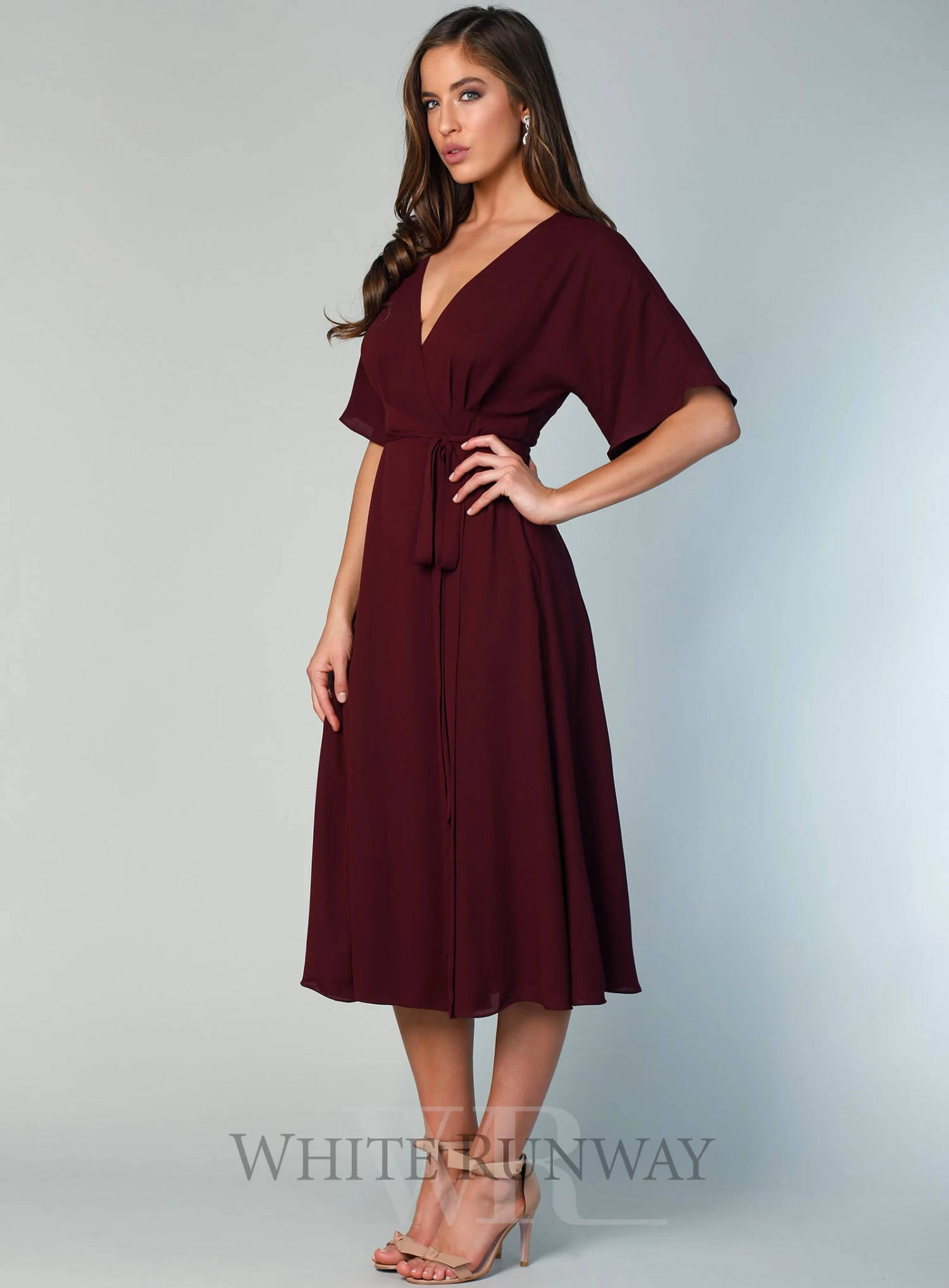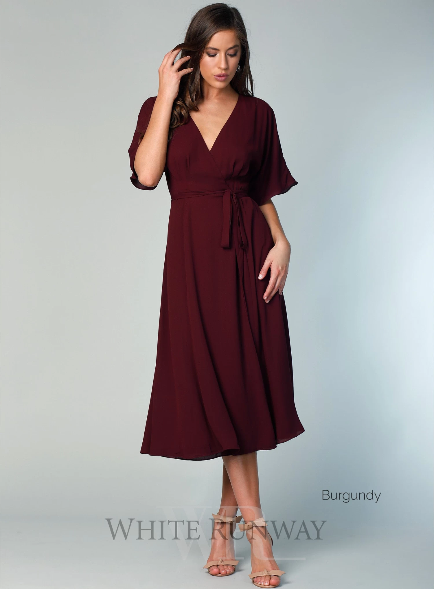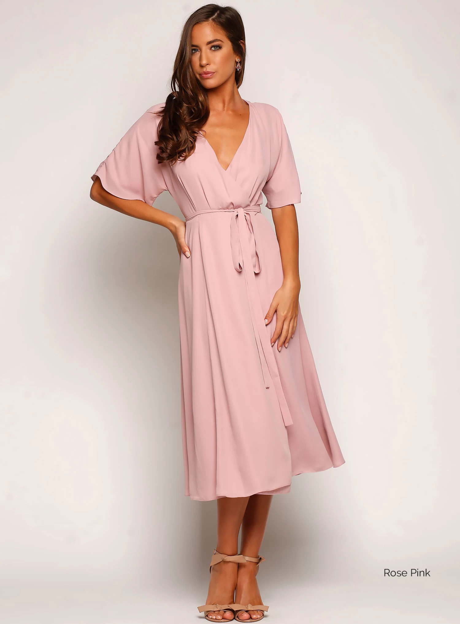 A beautiful midi length wrap dress by Samantha Rose. A v-neck style featuring a kimono sleeve bodice and self tie at waist.