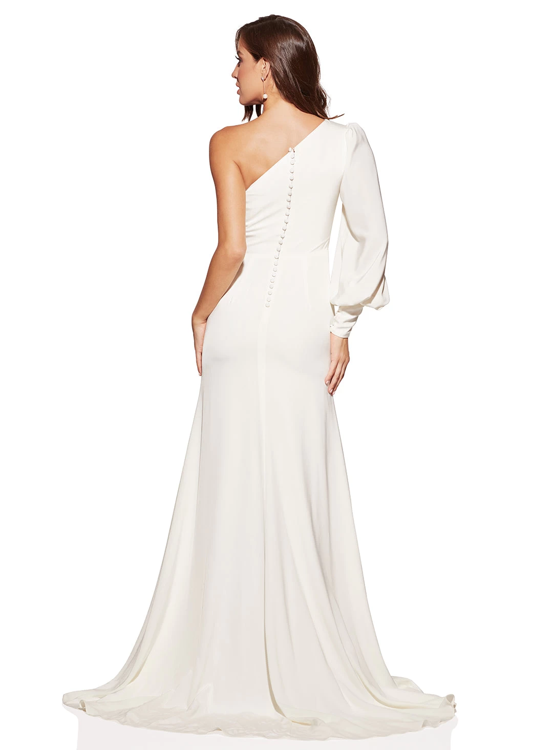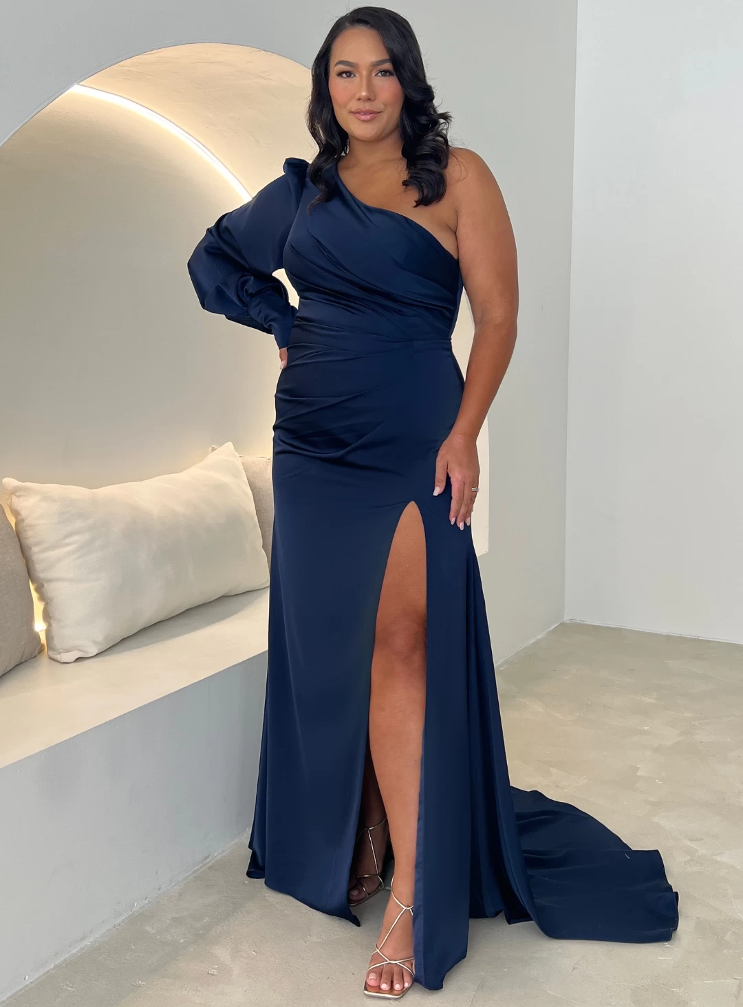 A stunning gown by Sofia Cali. A luxe satin style featuring one sleeve, a ruched bodice and a floor sweeping train with a thigh high side split.