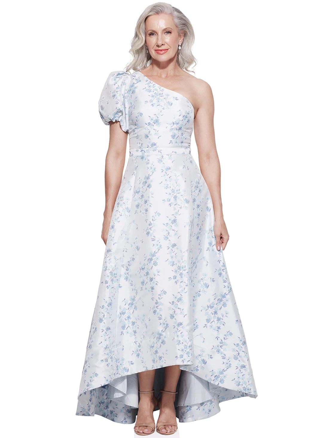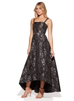 A gorgeous full length dress by Samantha Rose. Made in a brocade fabric, this style features a one shoulder sleeve, a high-low full skirt and metallic flower detailing.