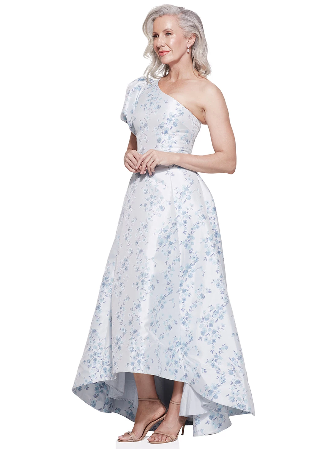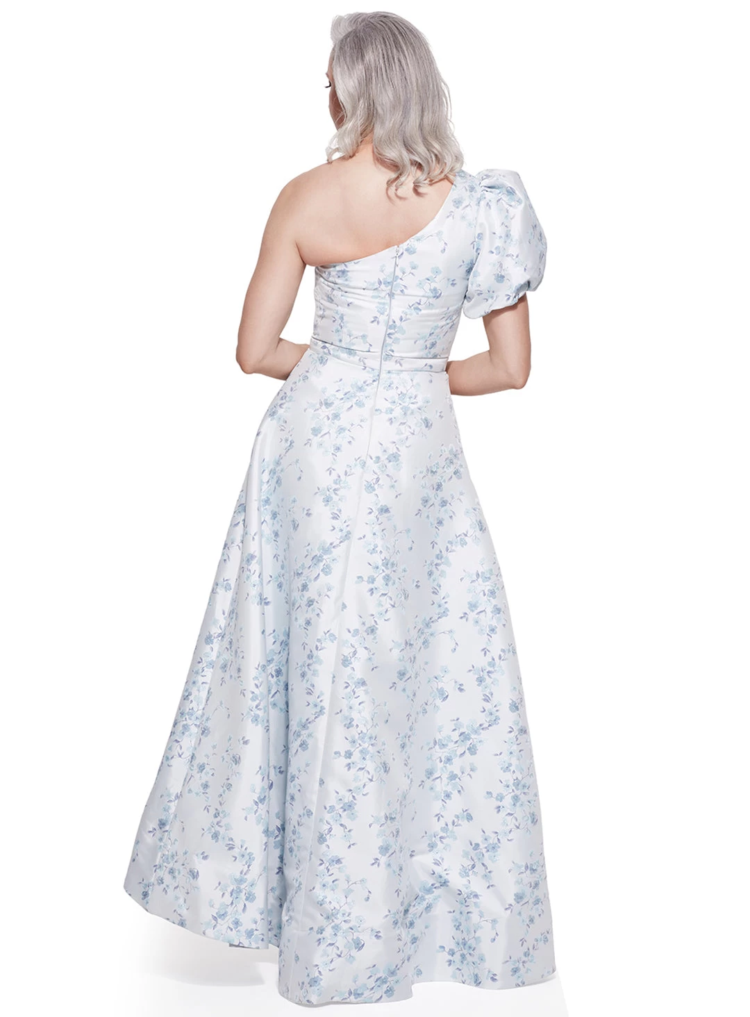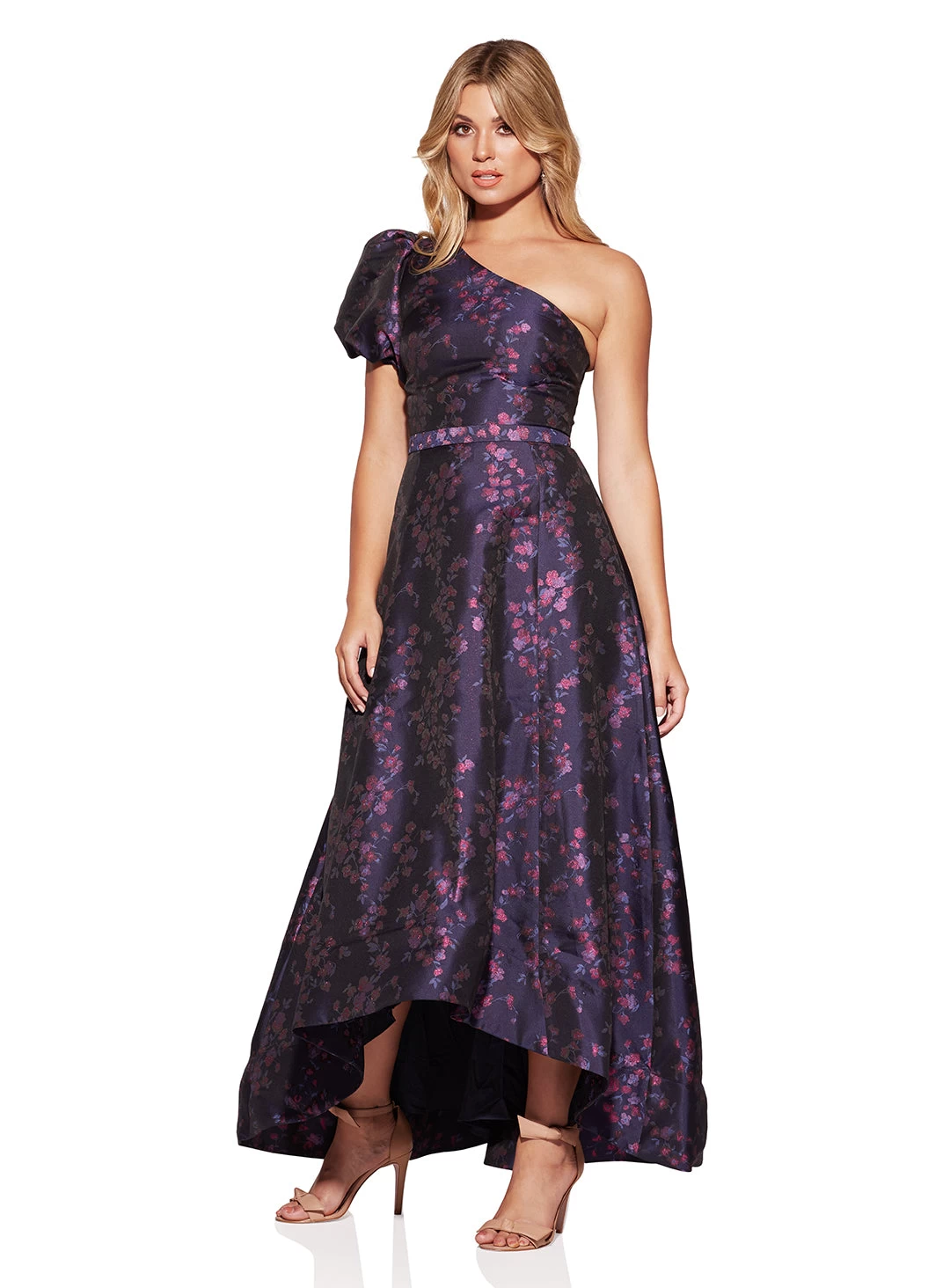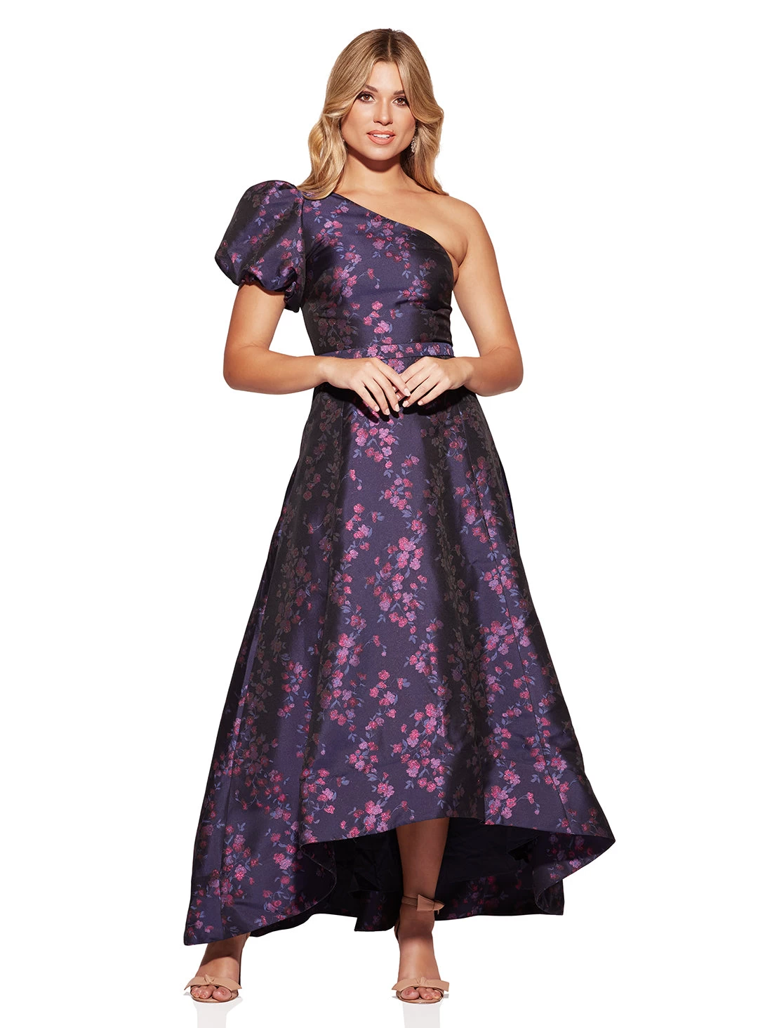 A gorgeous full length dress by Samantha Rose. Made in a brocade fabric, this style features a one shoulder sleeve, a high-low full skirt and metallic flower detailing.
