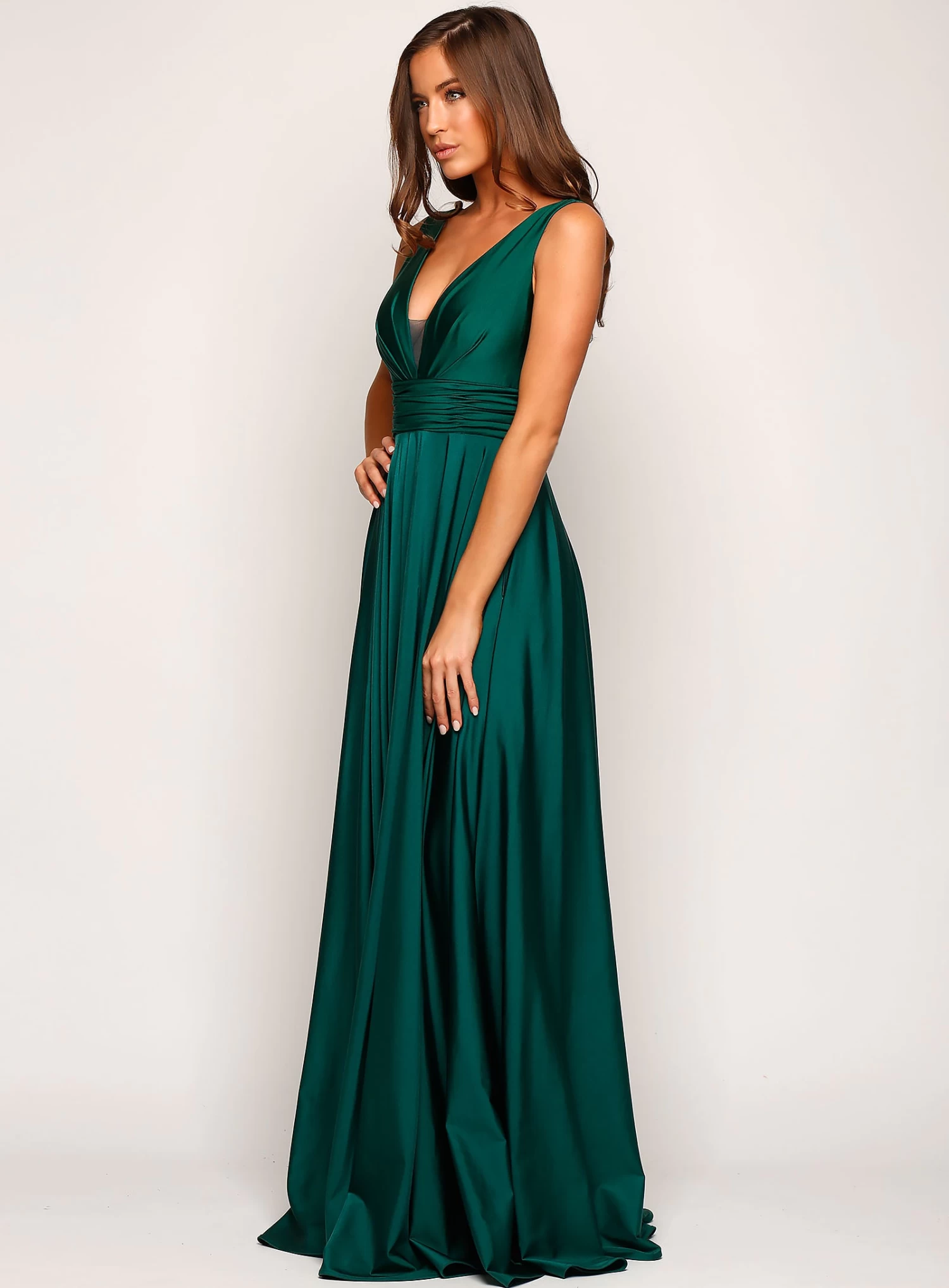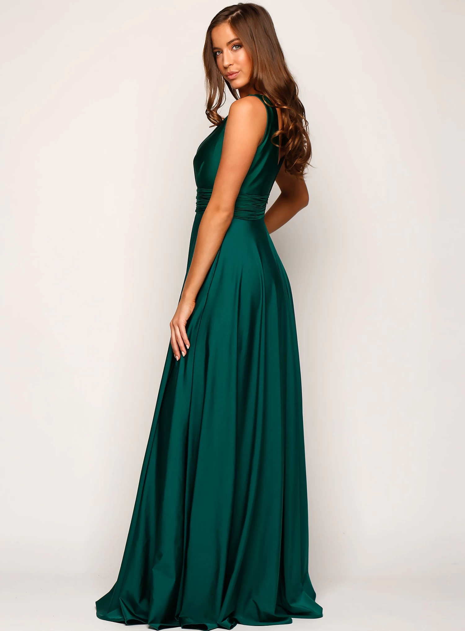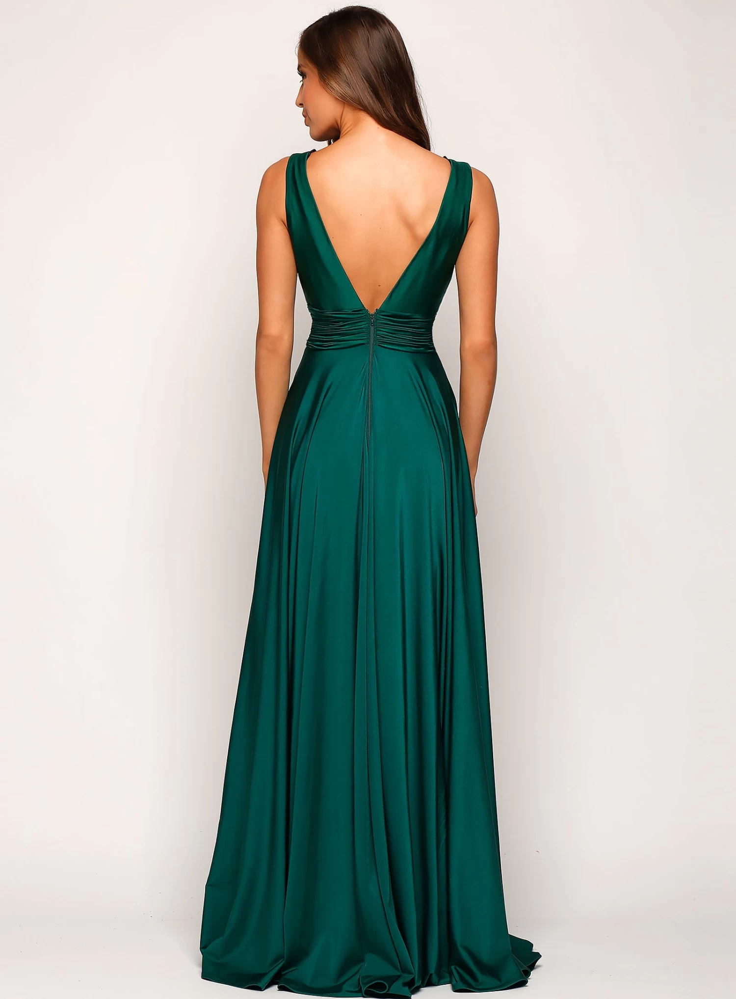 A gorgeous full length style by Jadore Evening JX3053. Featuring a v neckline with mesh insert, ruched waist band and full floor sweeping skirt.