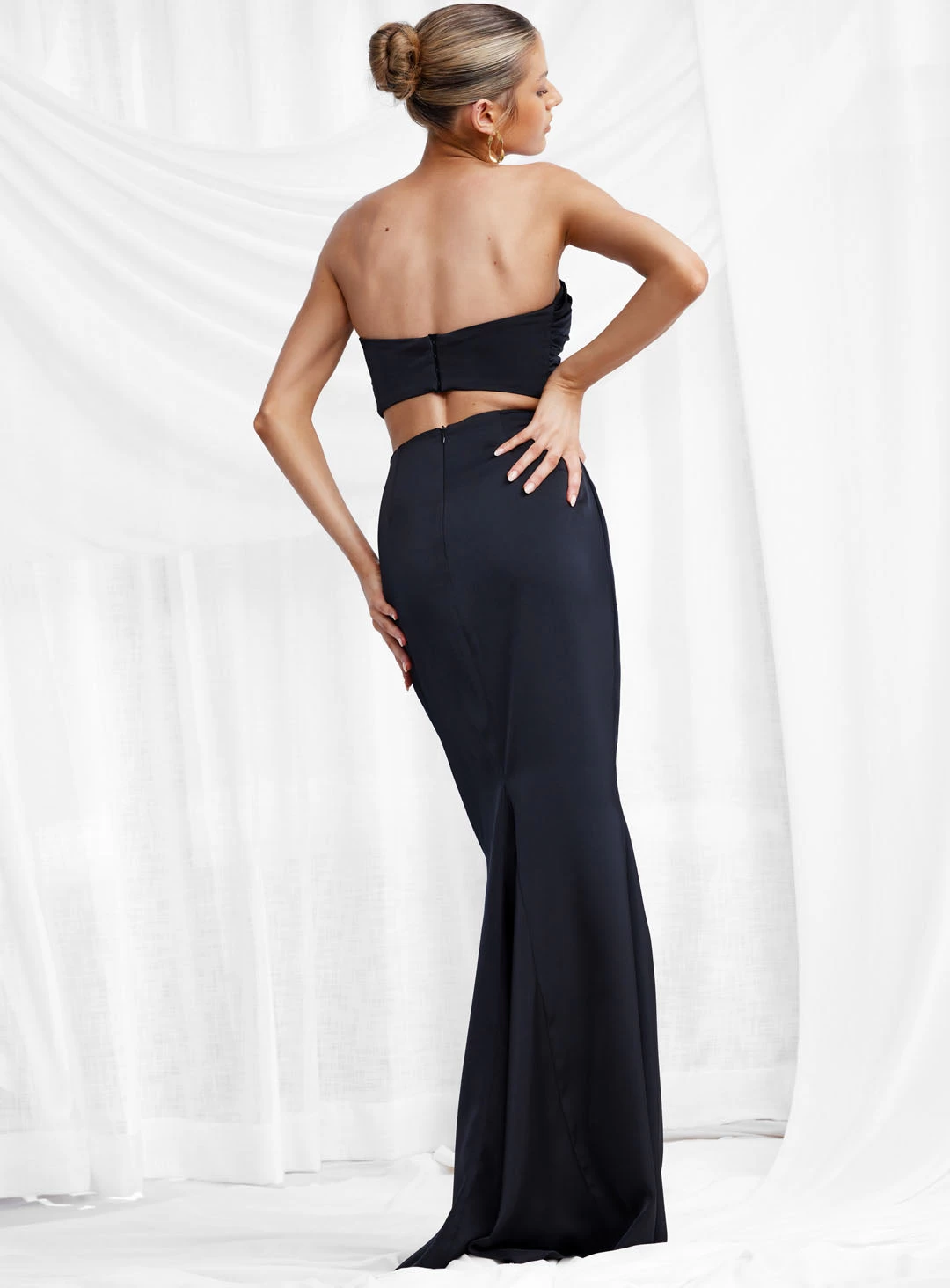 A stunning two piece set by Lexi. The Lara Bodice is a strapless bodice top with delivate horizontal rouleau straps at the centre. The Murilo Skirt is a high waisted mermaid shaped skirt with godet and slight puddle train.