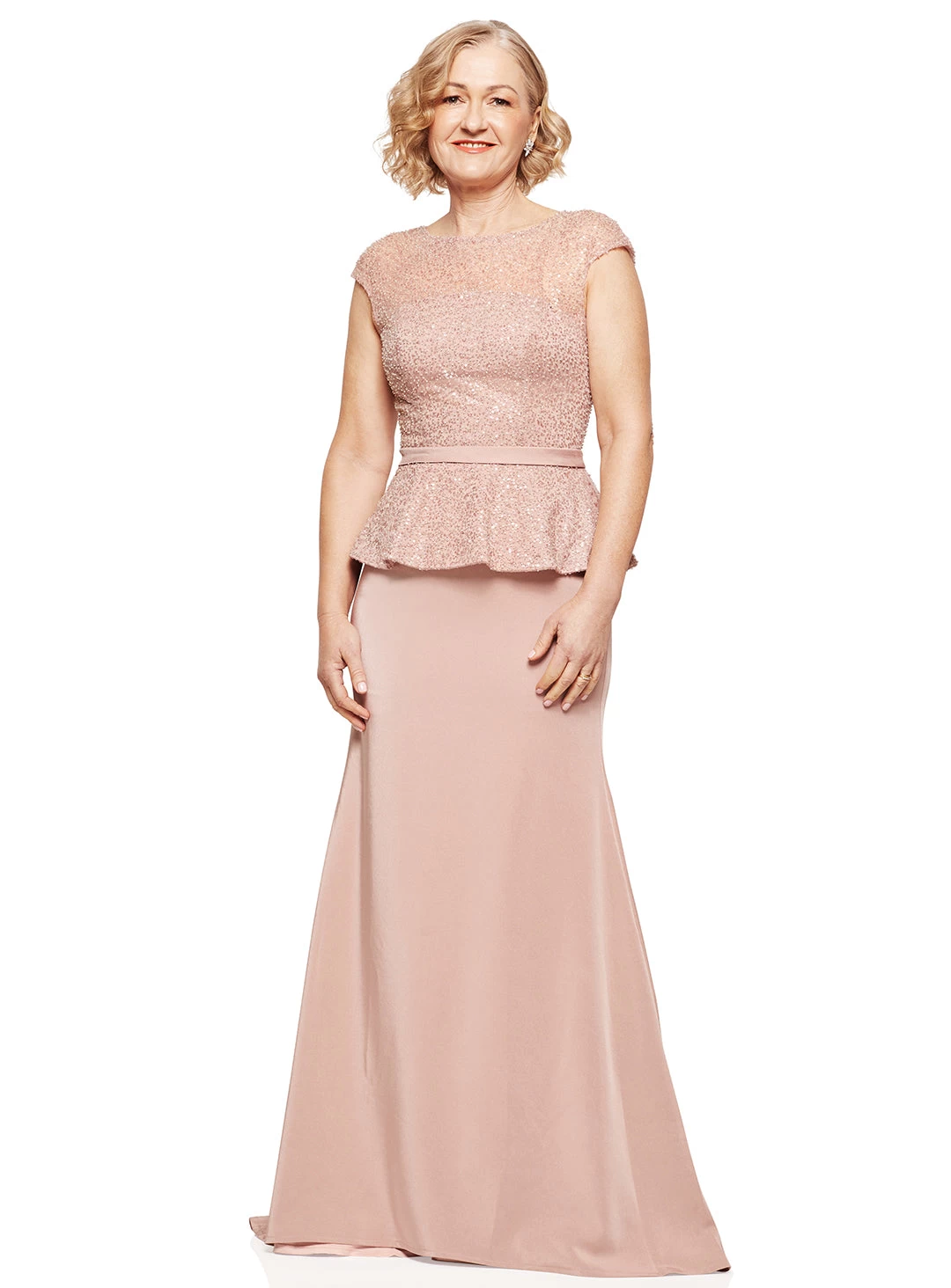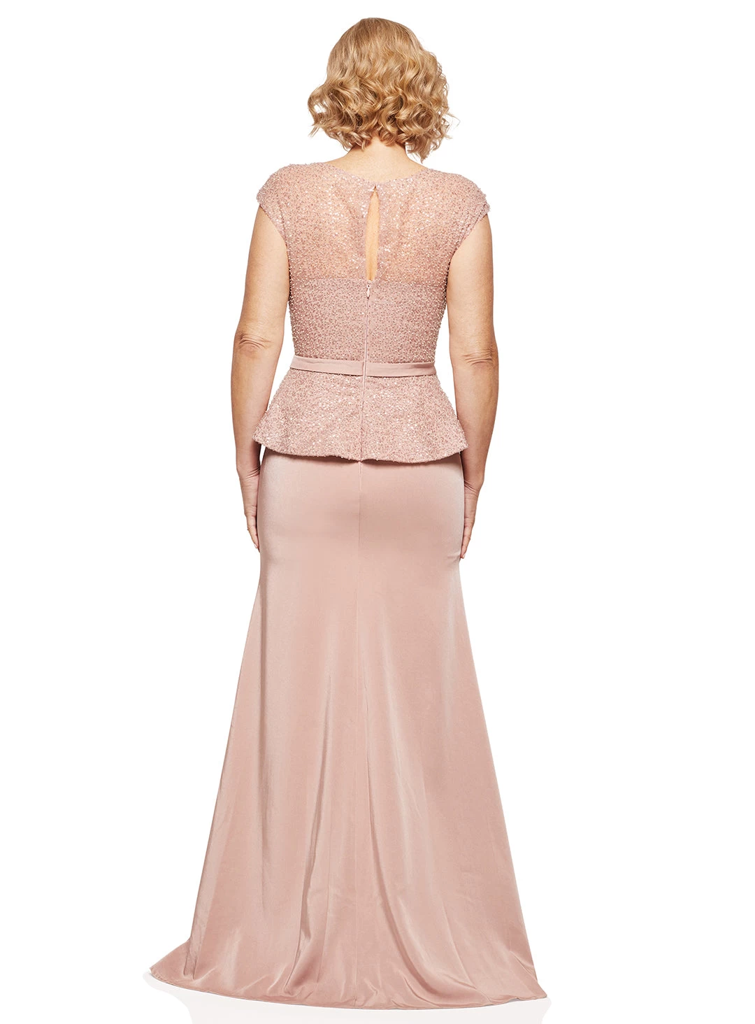 A gorgeous full length dress by Trellis Lane. Features a high neckline with sheer detailing and cap sleeves. Bodice is crafted from a delicate beaded fabric, with flattering peplum detail at the waist. Skirt is made from a woven satin crepe with flattering ruched details.