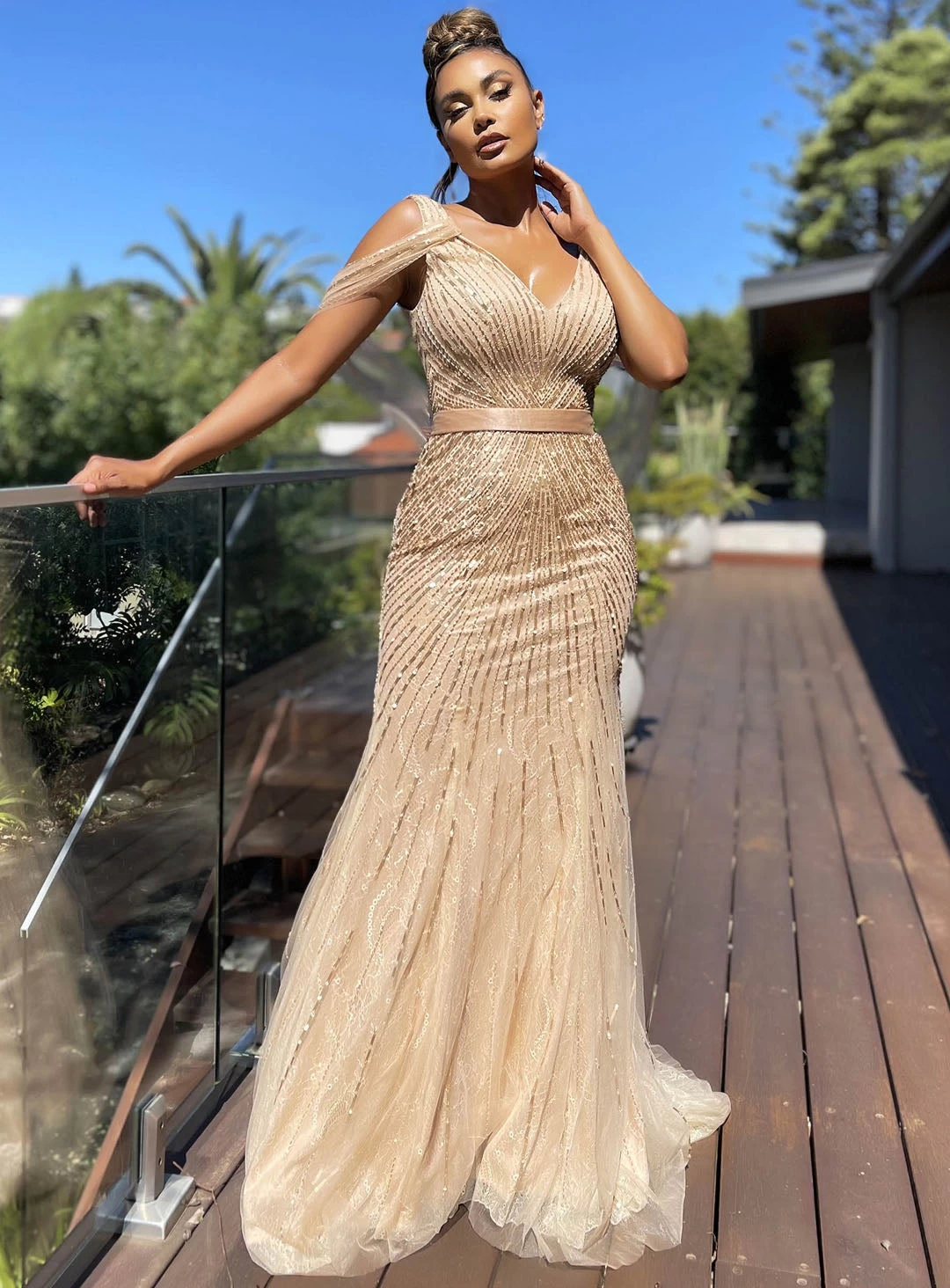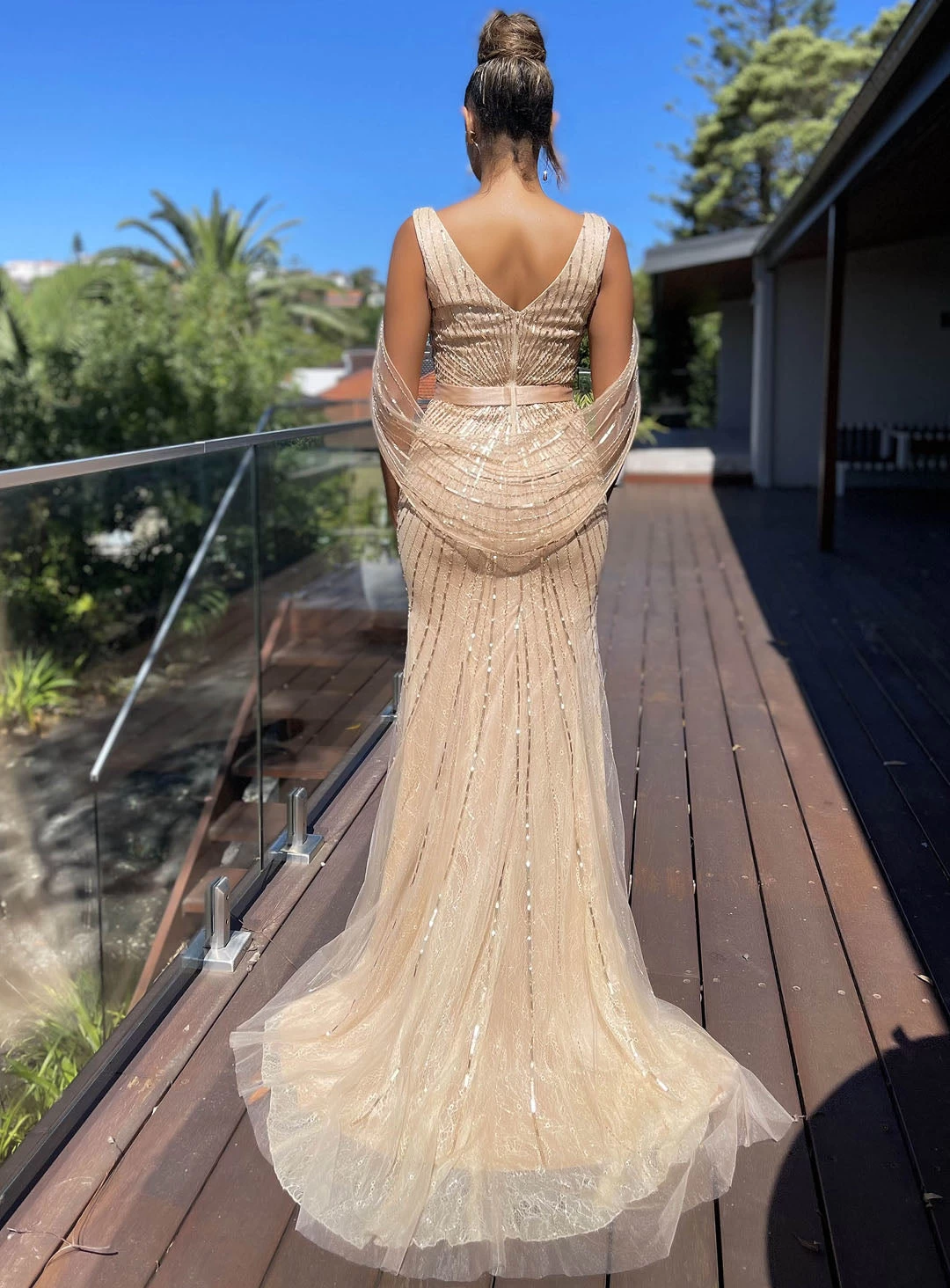A stunning full length gown by Jadore JX5048. A v-neck design featuring intricate sequin and beading detail.