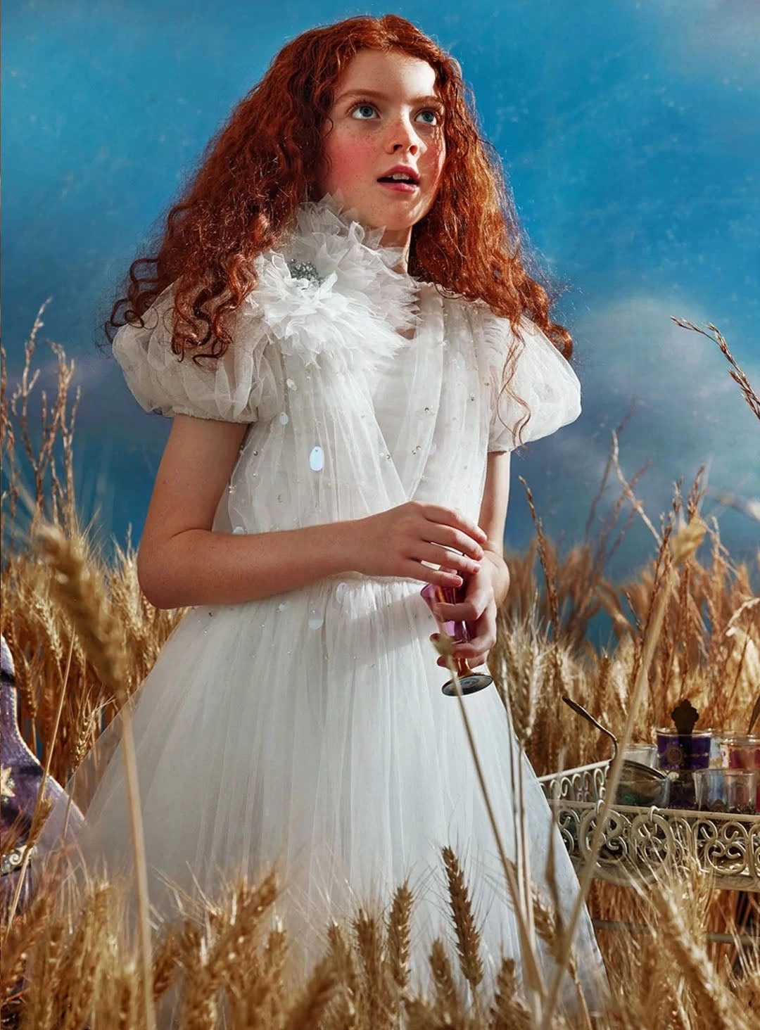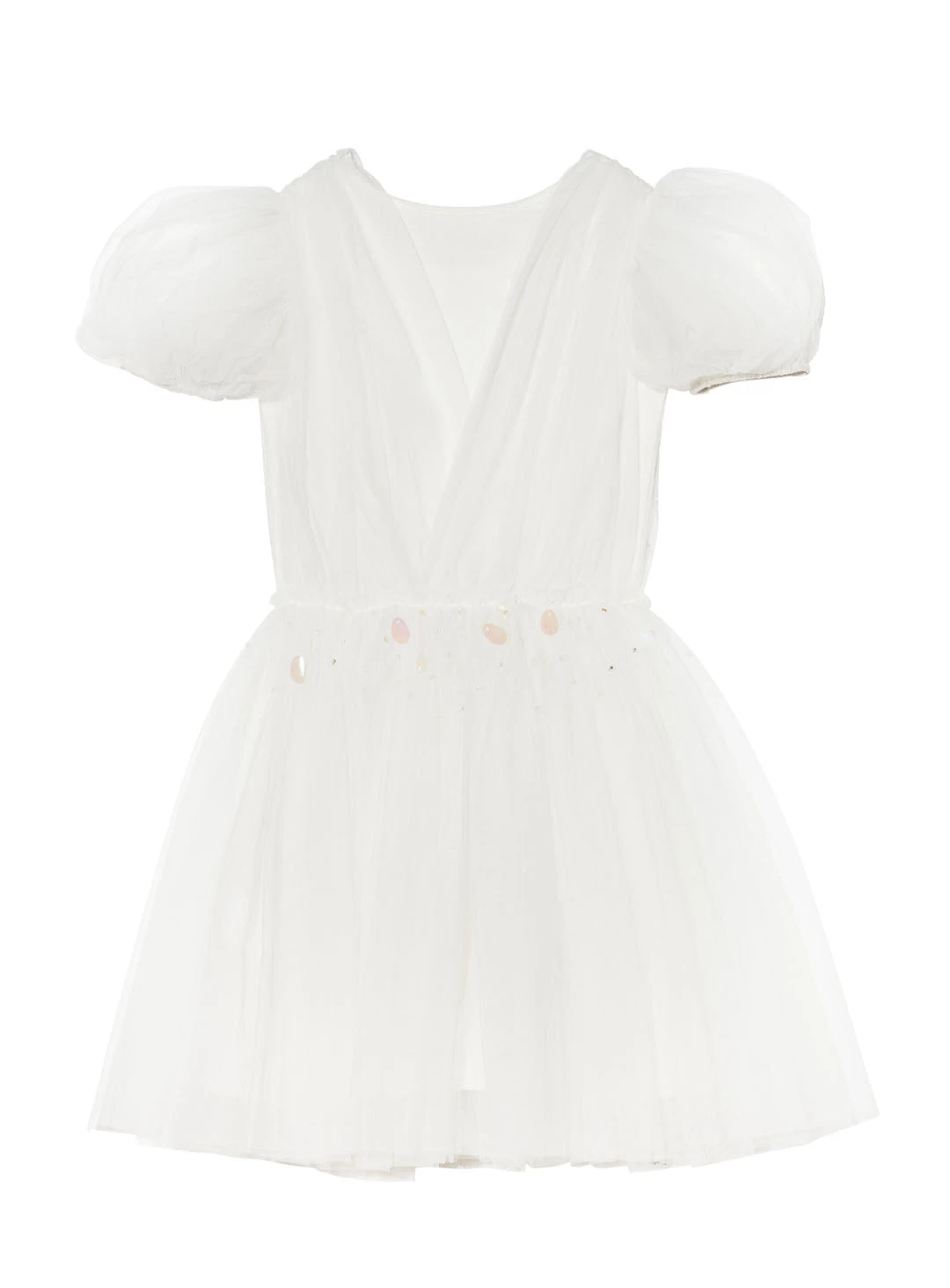 A gorgeous dress by Tutu Du Monde. Features a full skirt of soft tulle, delicate iridescent discs and beads on the bodice, and dramatic capped tulle sleeves.