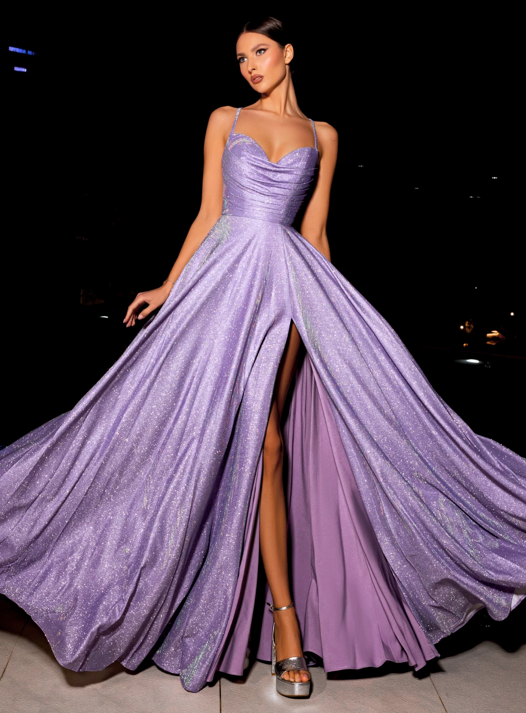 A gorgeous full length dress by Nicoletta NC2029. A flattering design featuring a full al-line skirt, lace up back and a thigh high split.