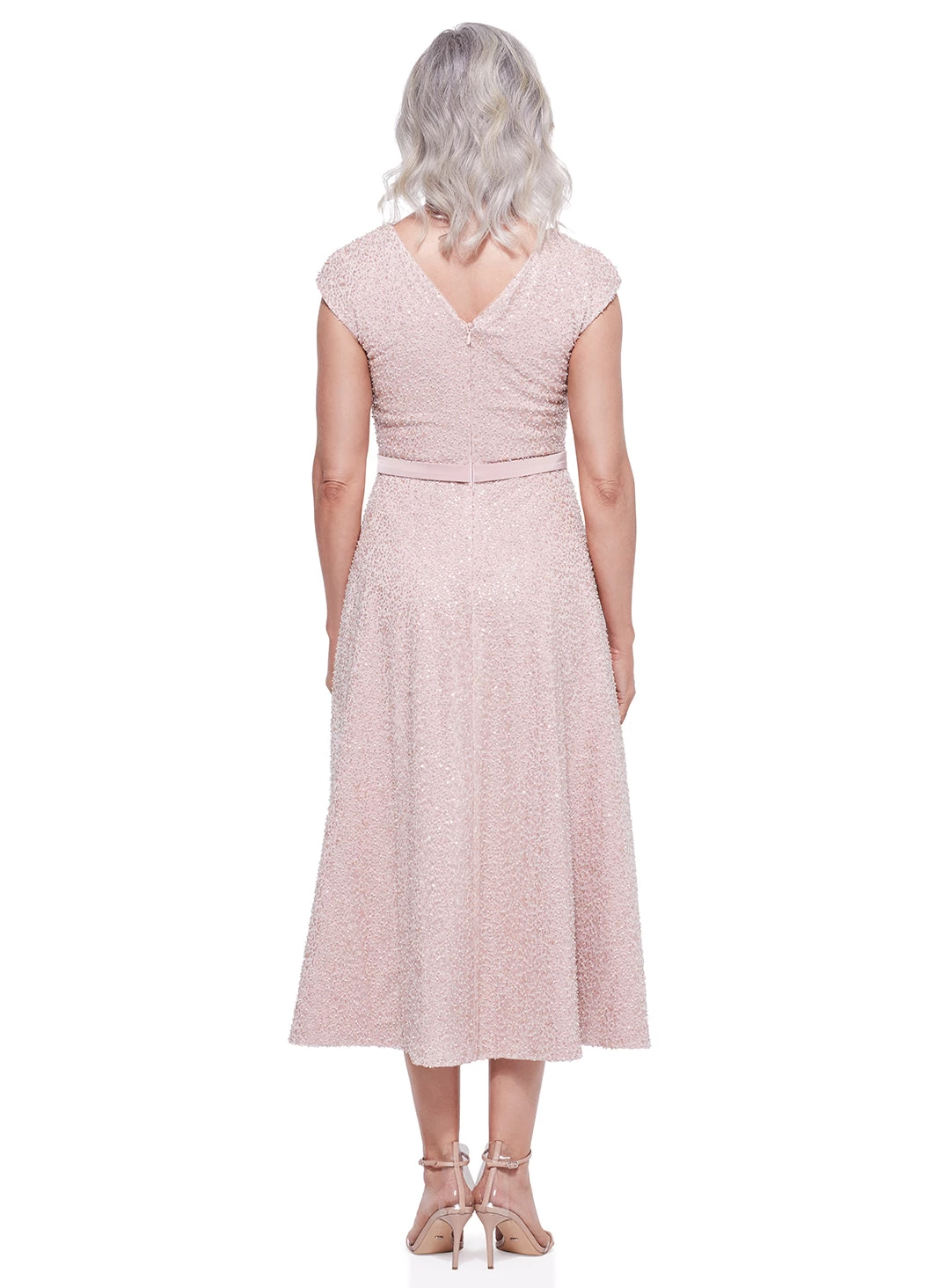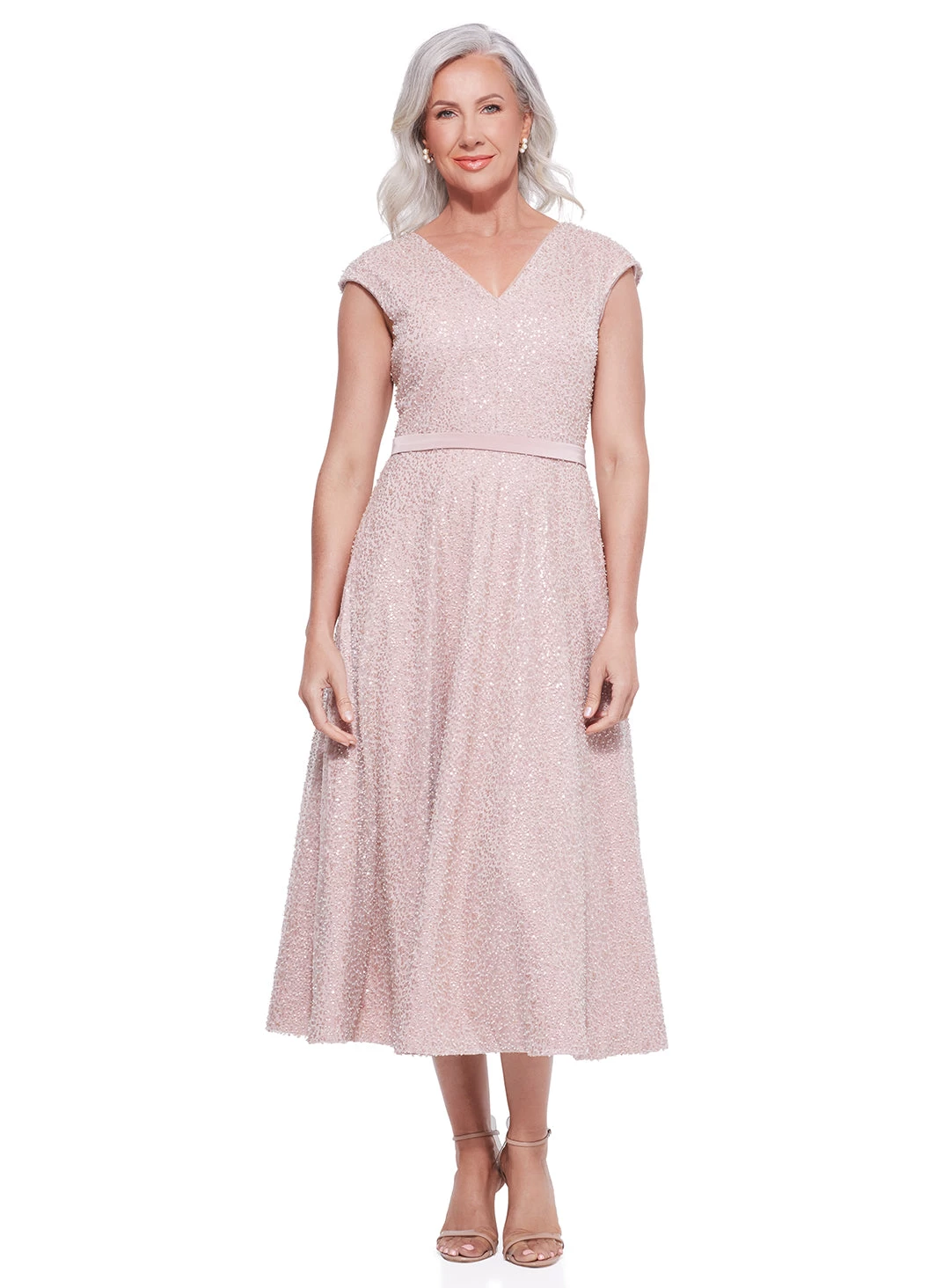 A gorgeous midi length dress by Trellis Lane. A flattering a-line style featuring a sequin overlay, deep v neckline and waistband.