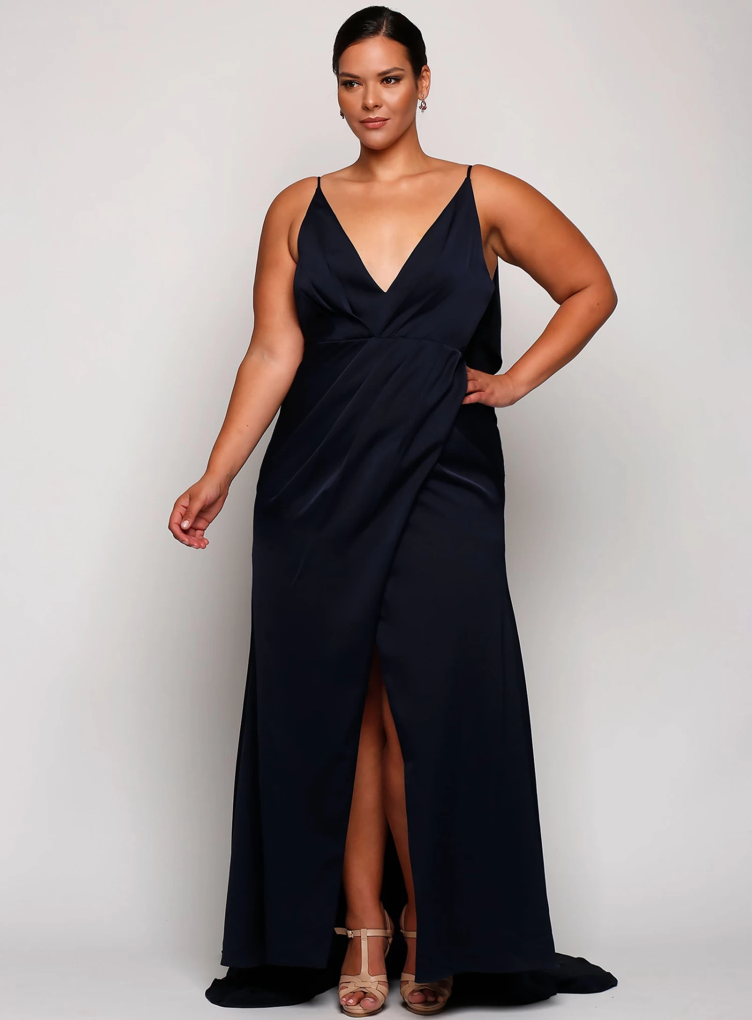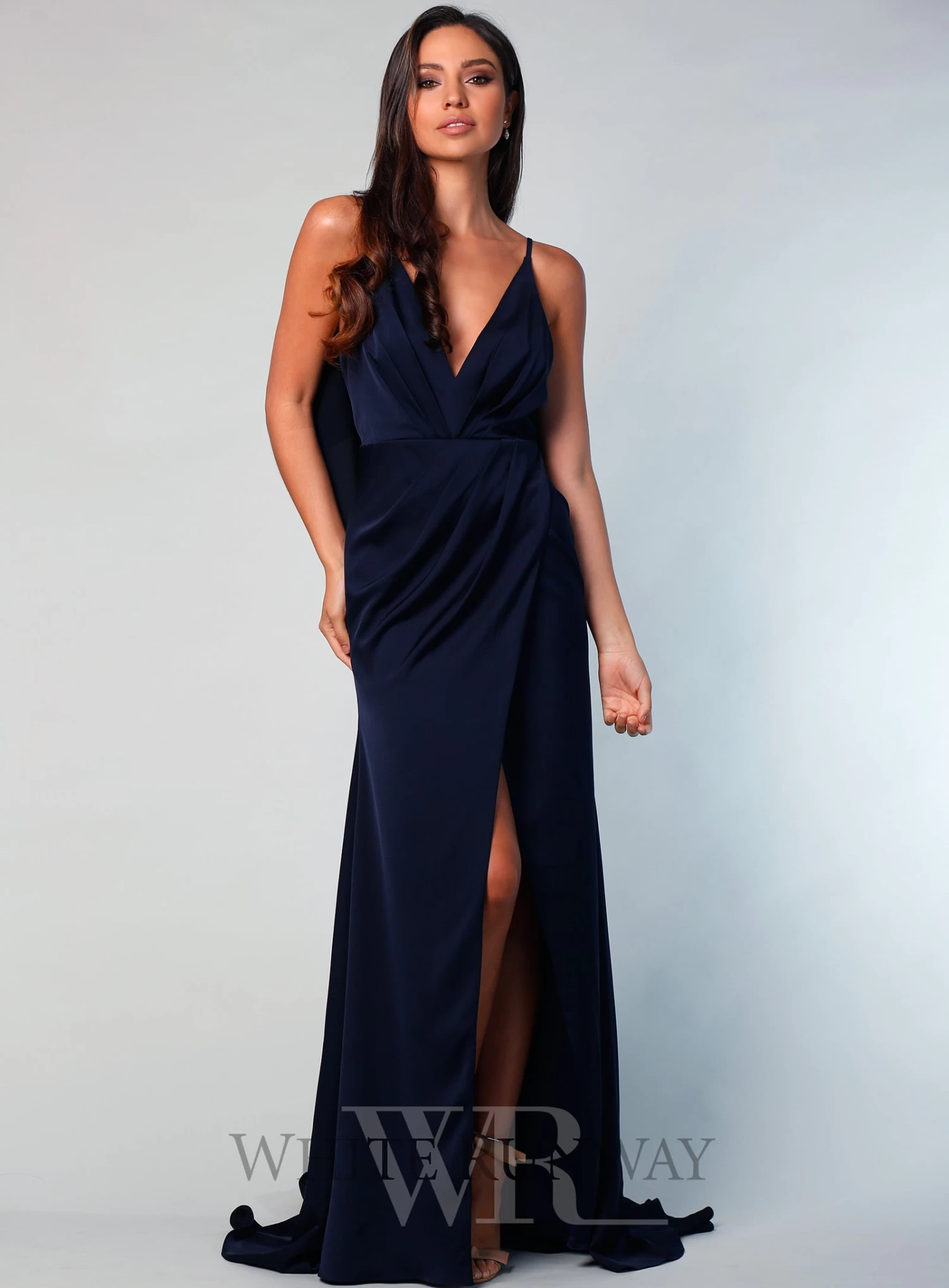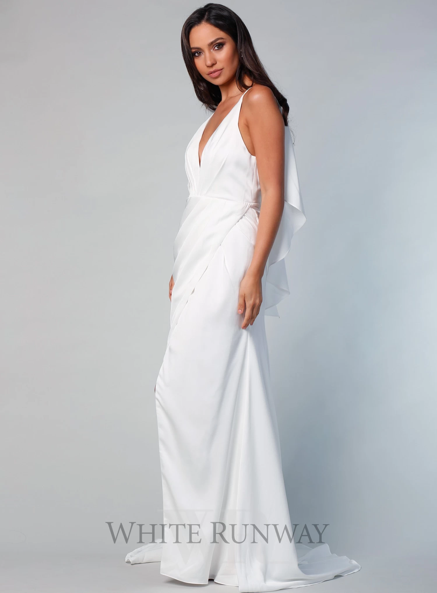 A stunning full length dress by Sofia Cali. A v-neck style featuring a wrap skirt with flattering gathers on the waistline and flowy overlay on the back.