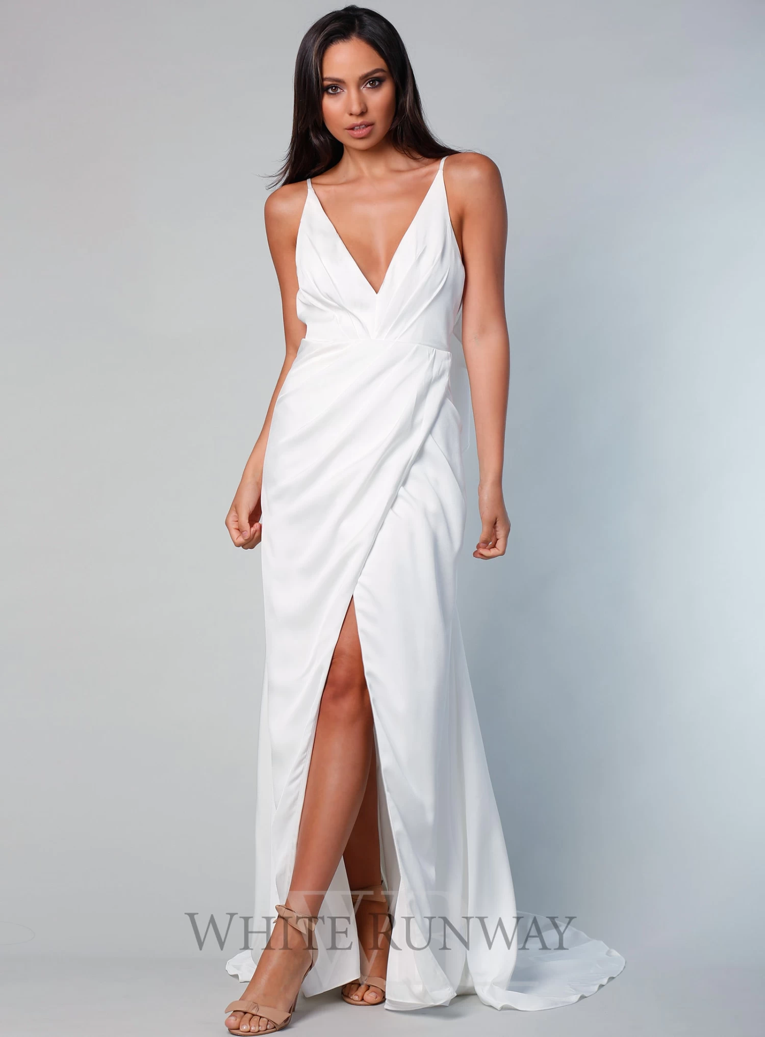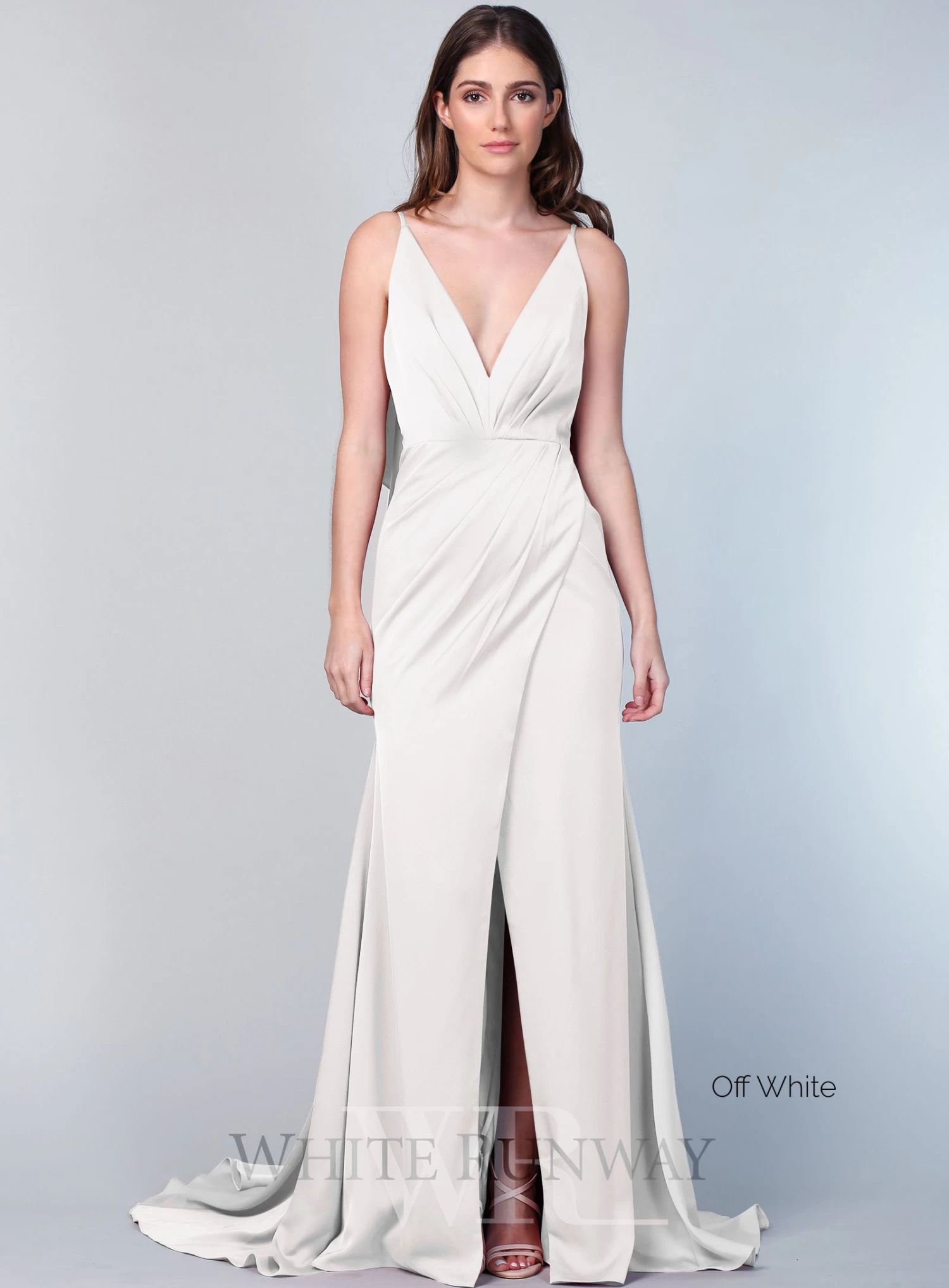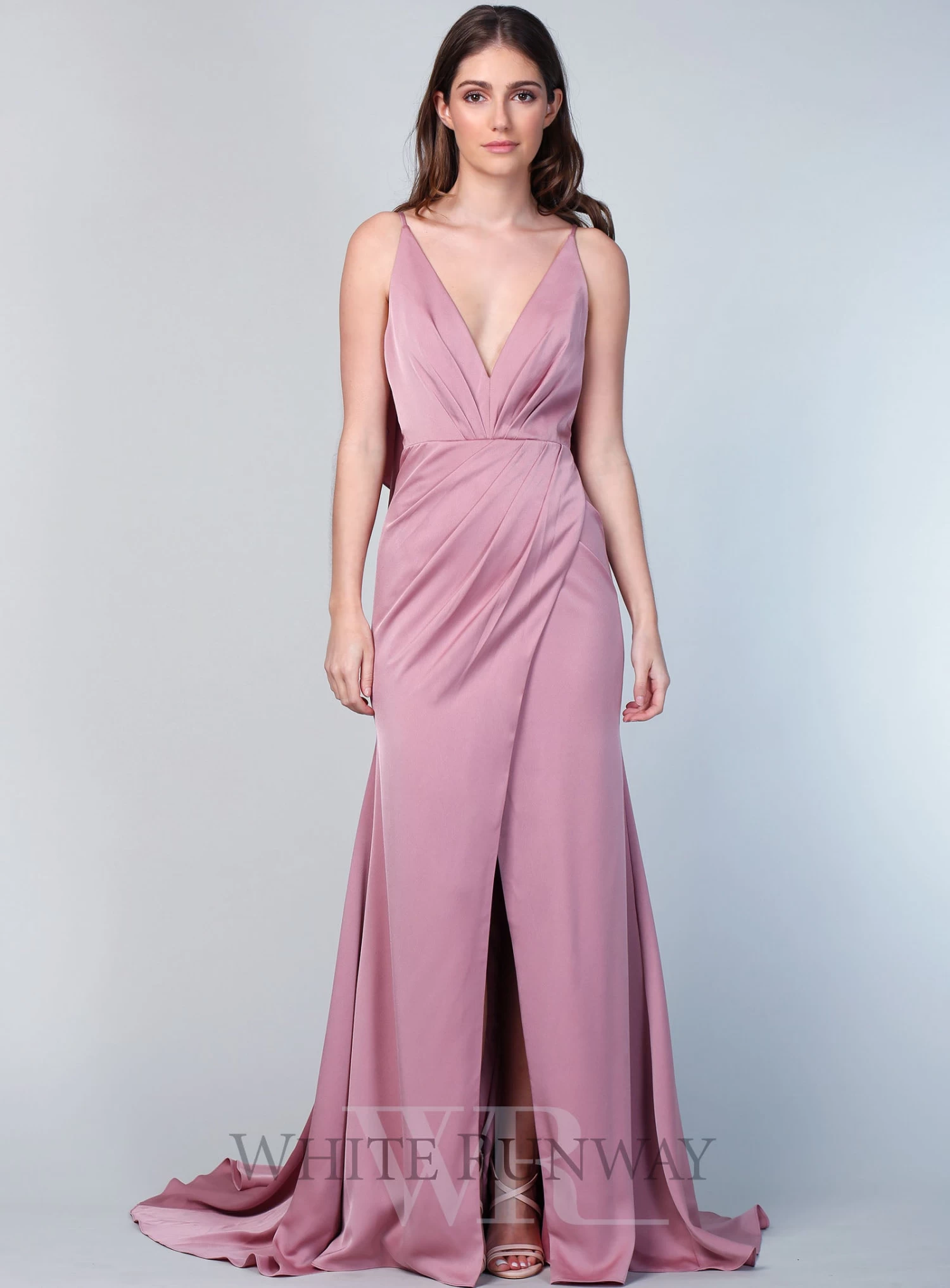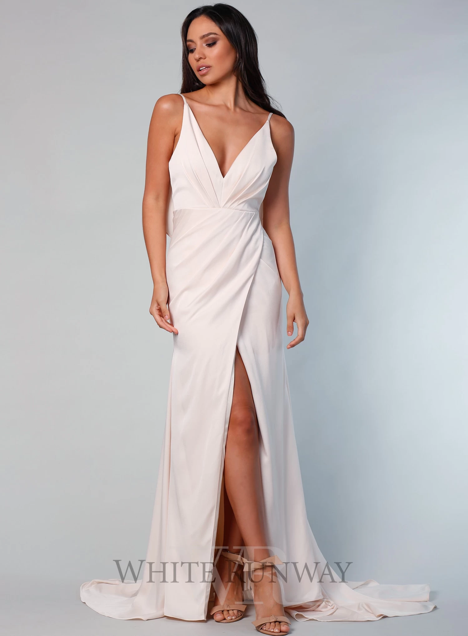 A stunning full length dress by Sofia Cali. A v-neck style featuring a wrap skirt with flattering gathers on the waistline and flowy overlay on the back.
