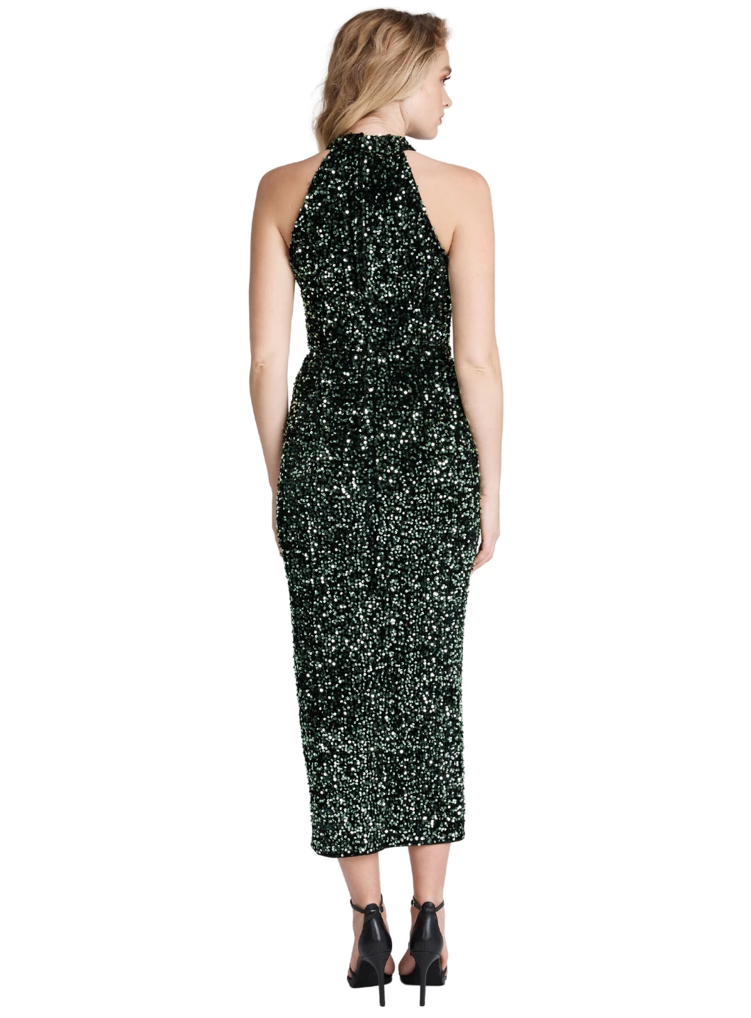 The Margot Maxi is a stunning full-length dress by Romance the Label. A high neck design featuring a thigh high split and crafted in a beautiful sequin fabric.