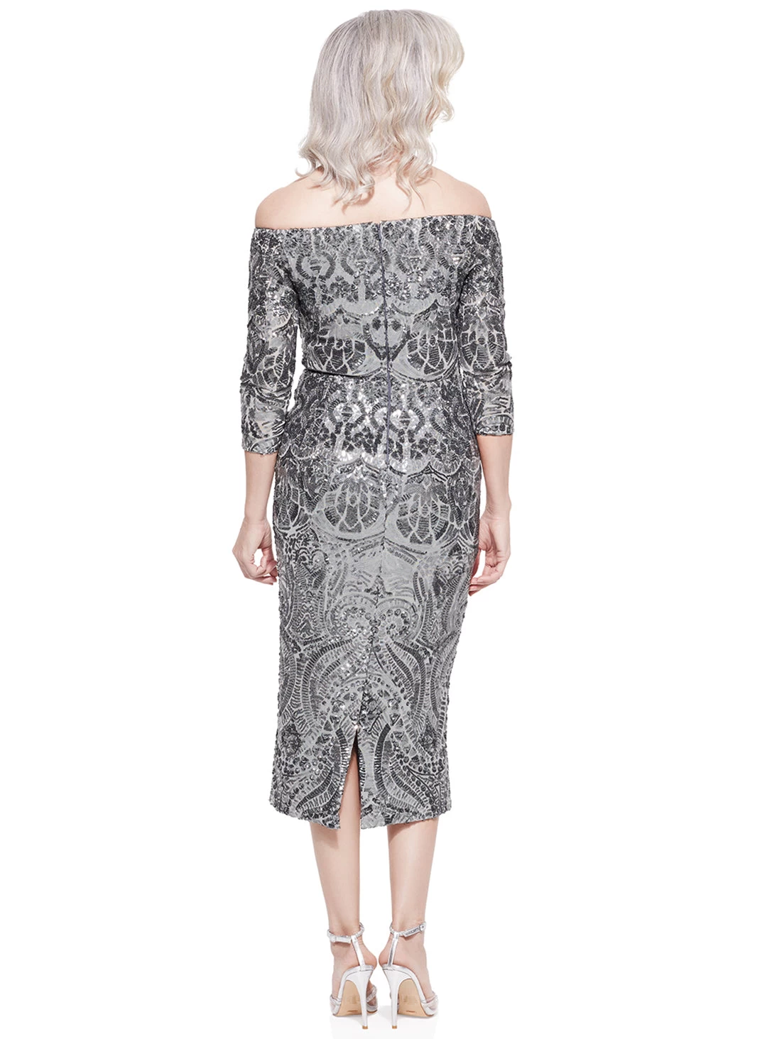 The Marion dress is a gorgeous midi dress by Trellis Lane. A sequin patterned design with a off shoulder neckline and 3/4 fitted sleeves.