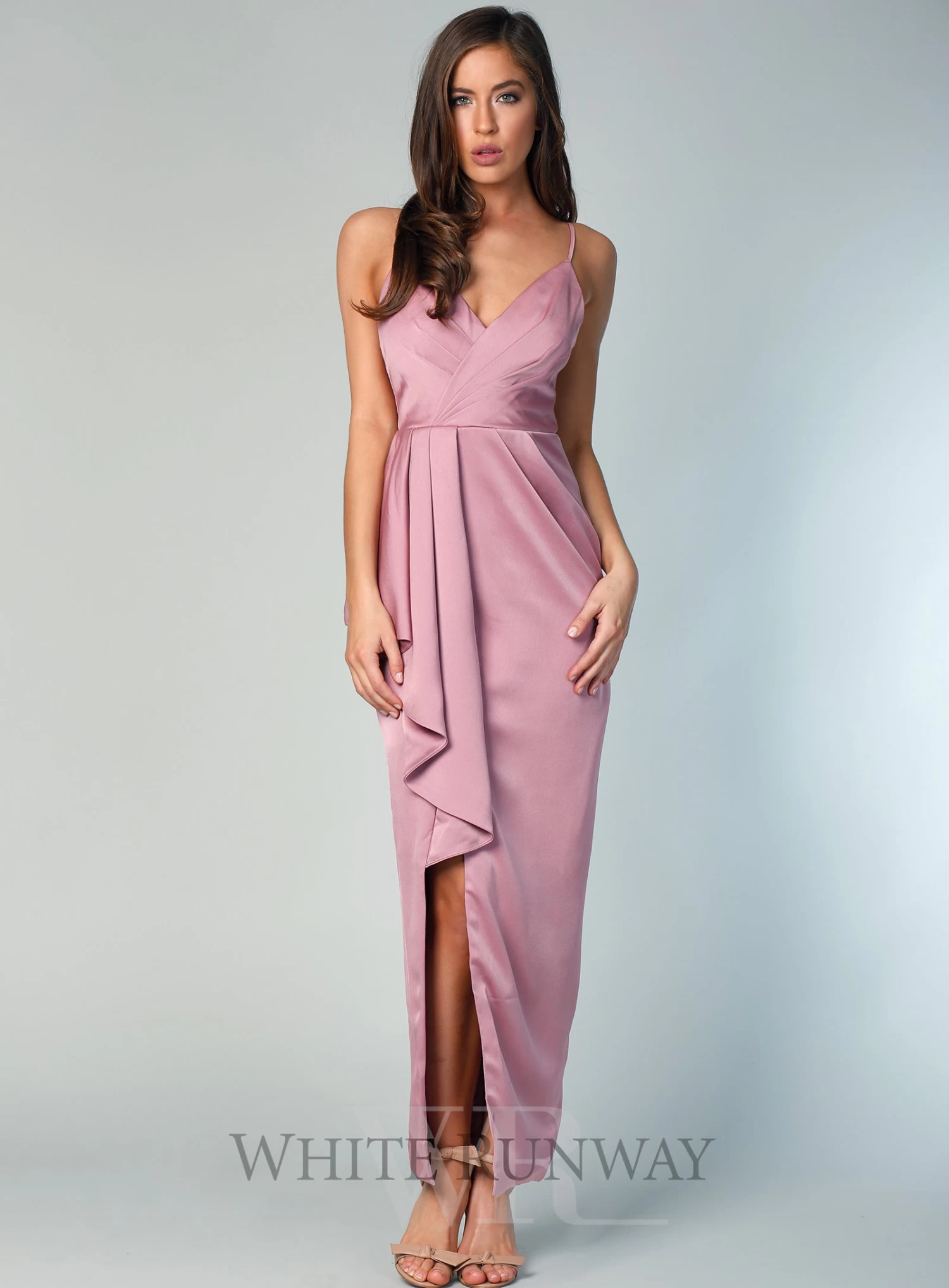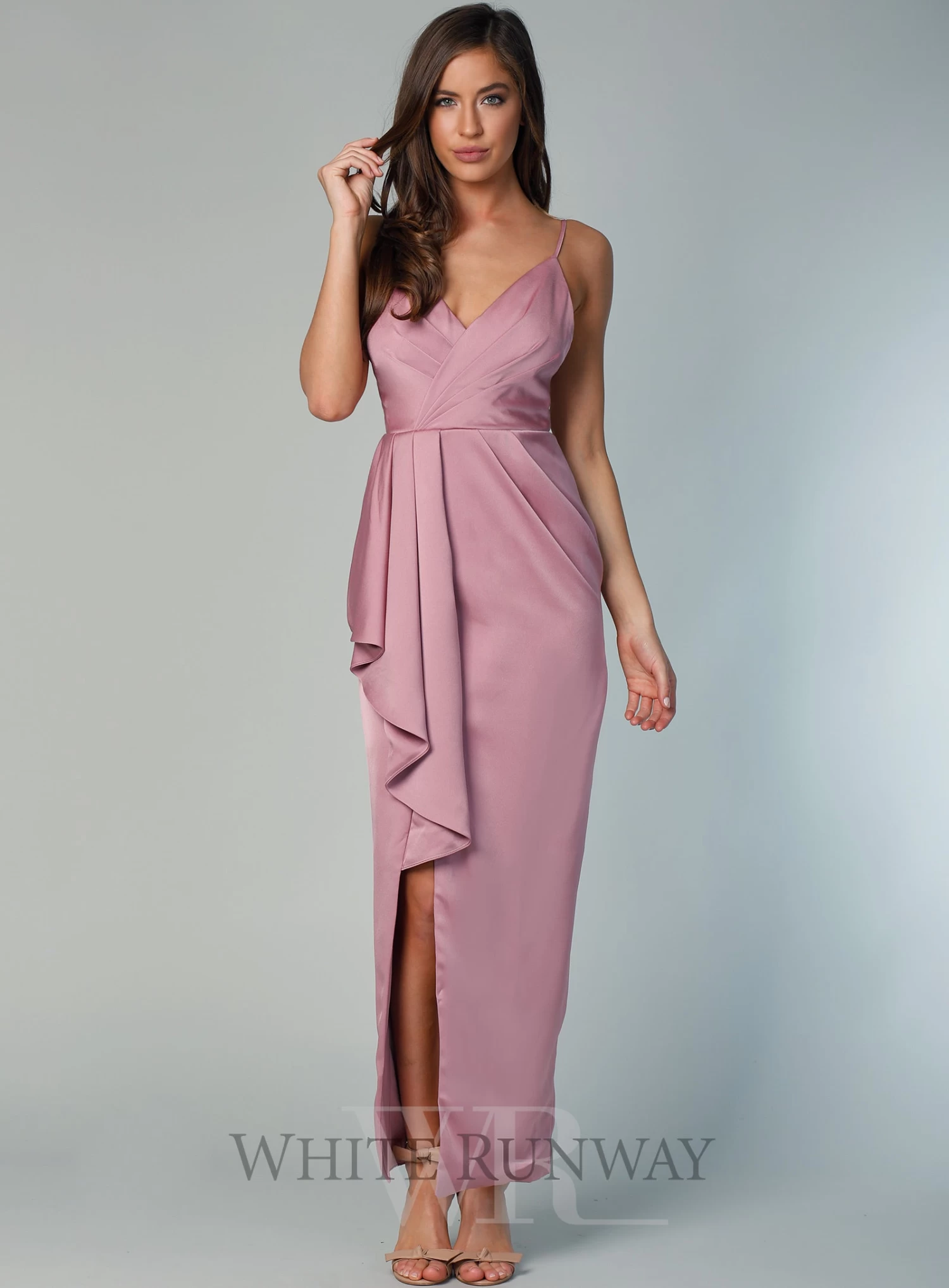 A gorgeous full length dress by Sofia Cali. A v-neck style featuring a 3D frill detail on the waist and thigh high leg split.