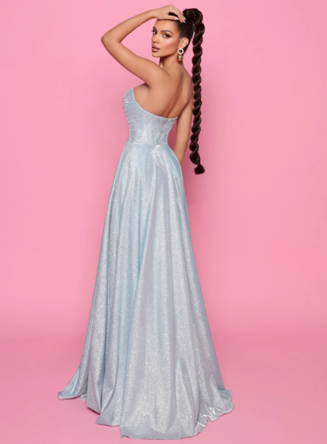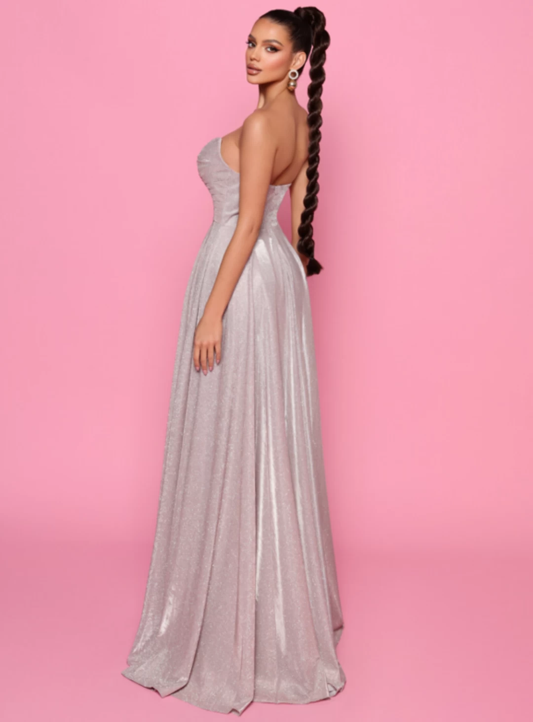 A stunning full length dress by Nicoletta NP149. A flattering strapless design featuring a draped overlay and crafted in a shimmer material.
