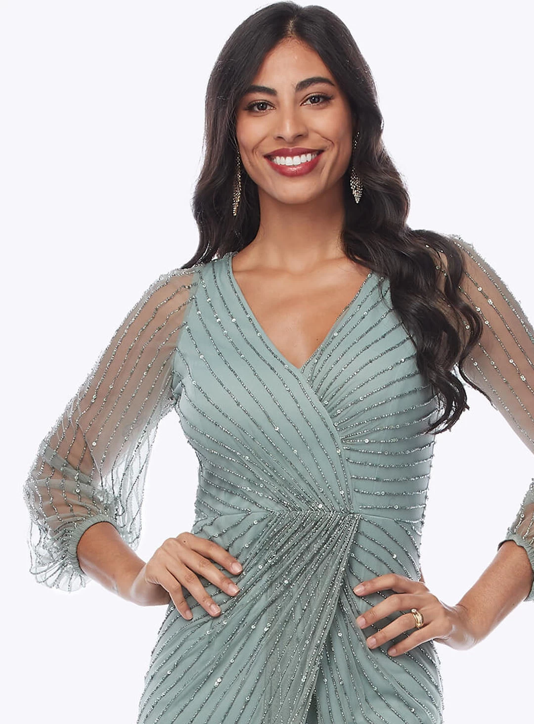 A gorgeous full length style by Zaliea. Featuring a cross over v style bodice with sheer sleeves and beading throughout.