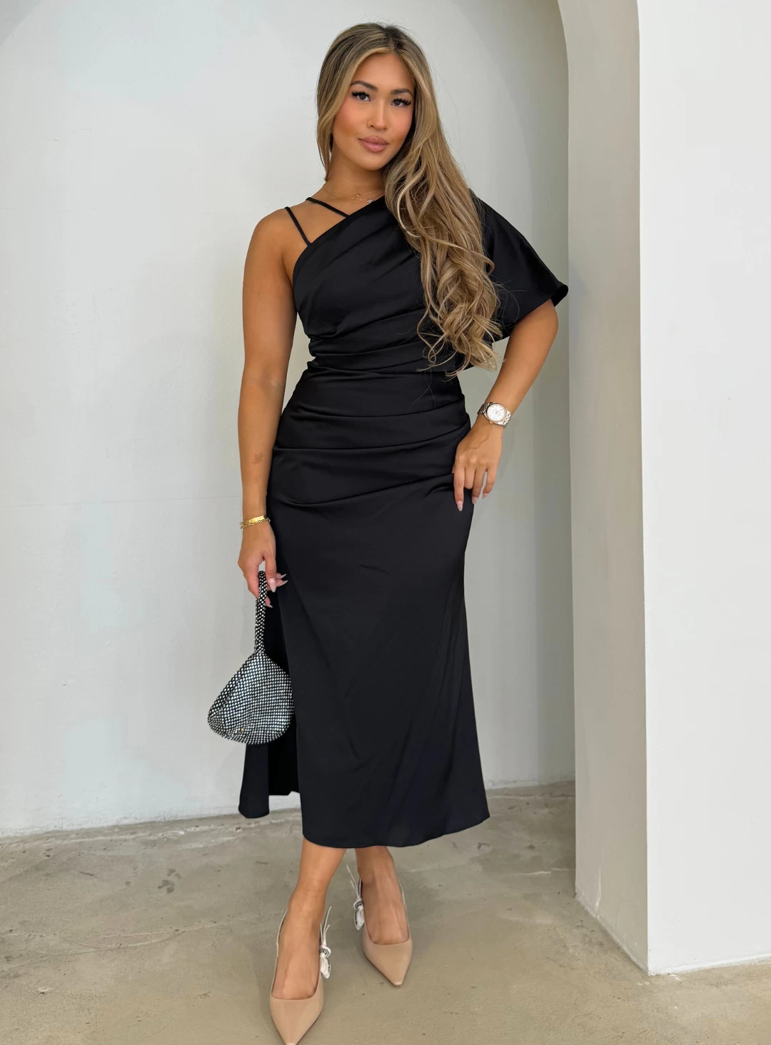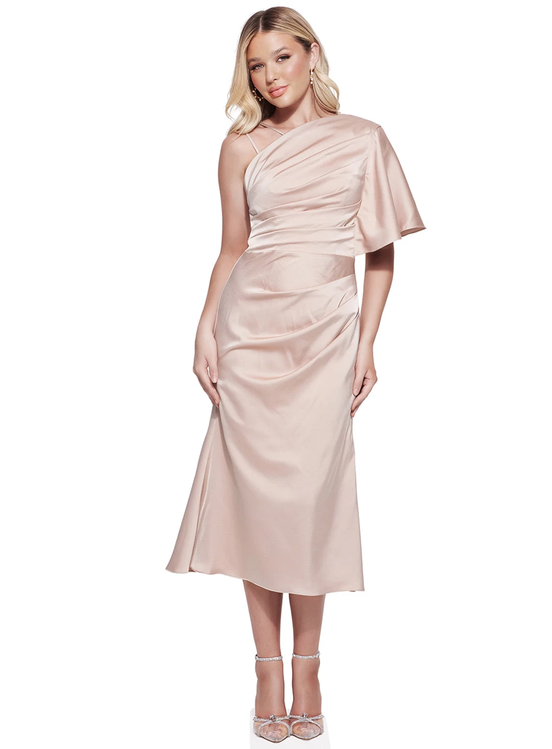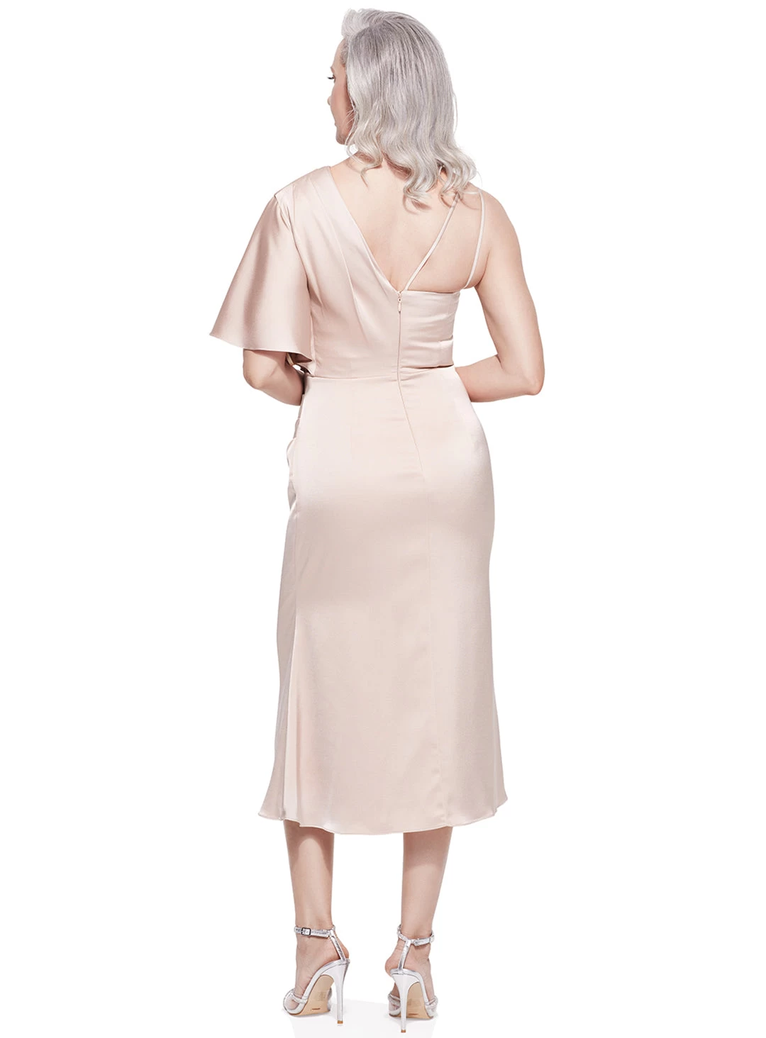 A stunning midi length dress by Sofia Cali. A satin style featuring an asymmetric neckline, flutter sleeve and flattering ruching across the skirt.