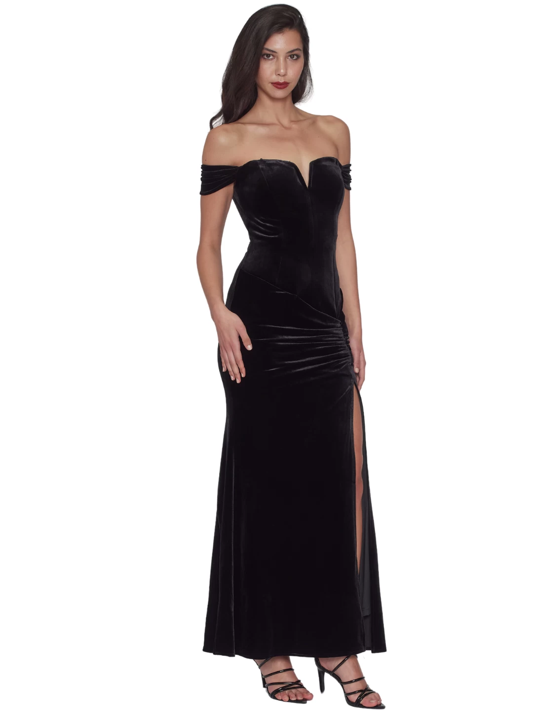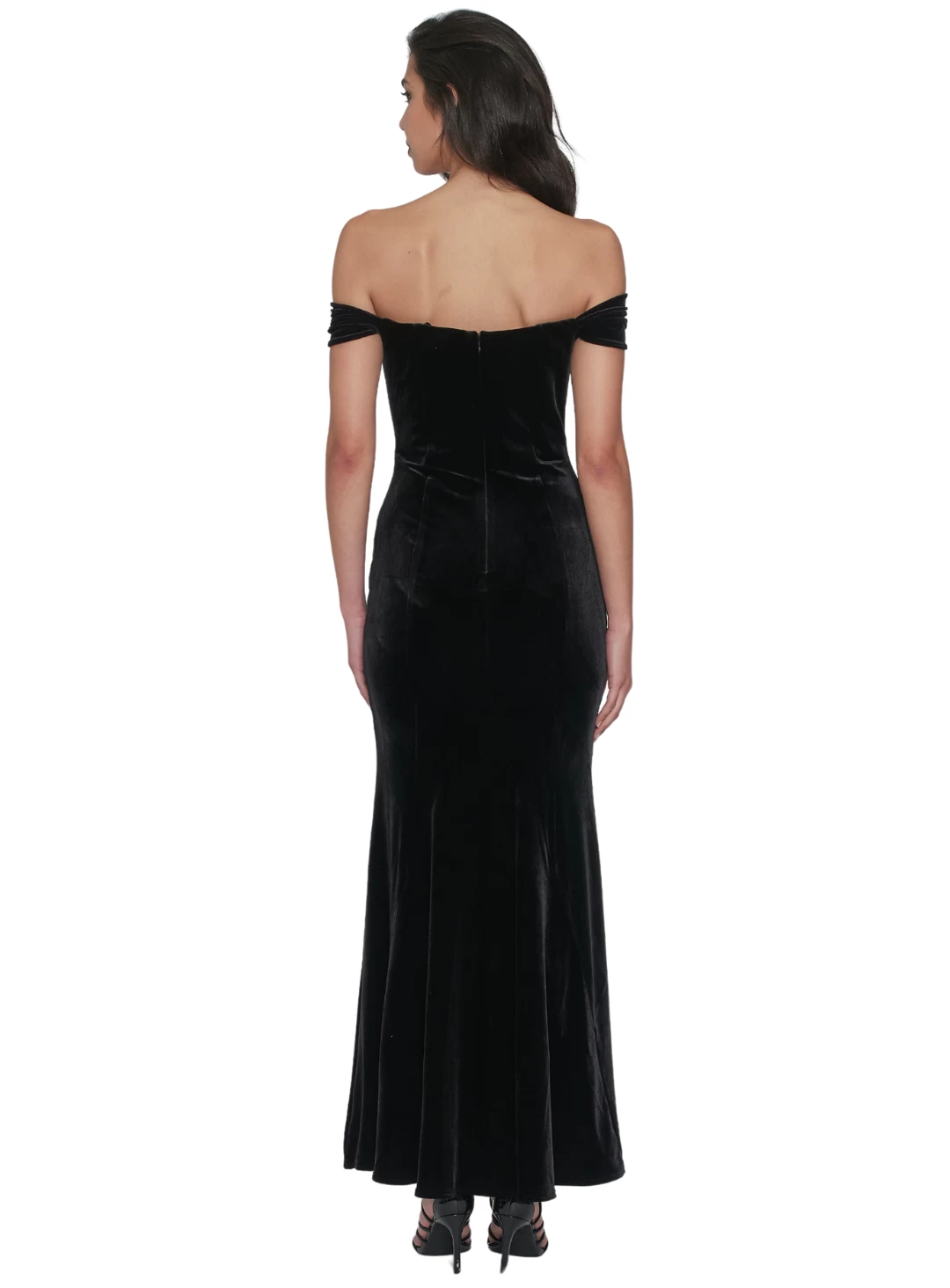 The Natalia Maxi is a stunning full length dress by Romance the Label. A gorgeous design featuring off shoulder sleeves, ruching across skirt and a thigh high split.
