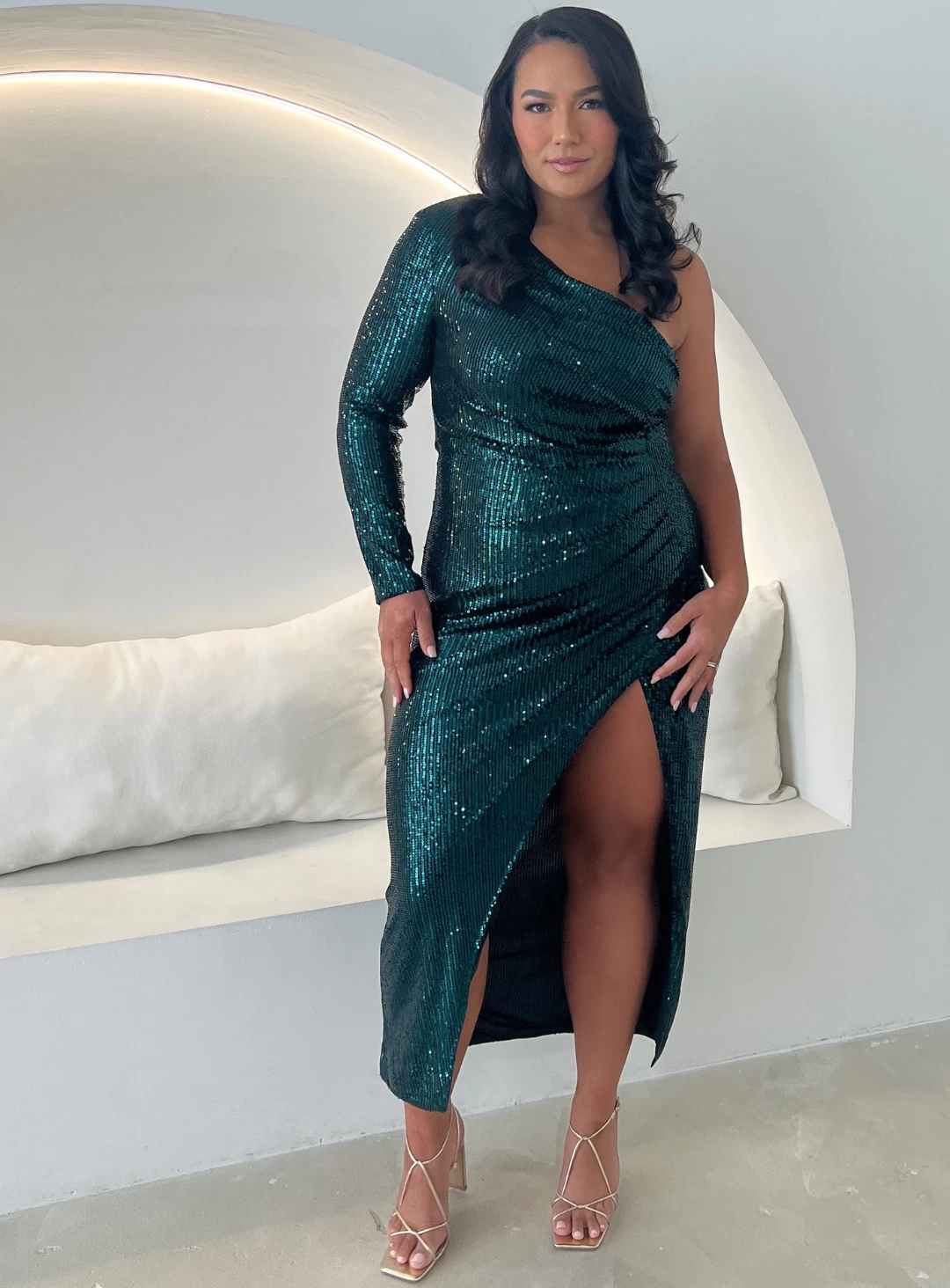 The Opal Dress is a stunning midi dress by Elle Zeitoune. A one shoulder dress featuring a ruched detail on the hips and sexy side split.