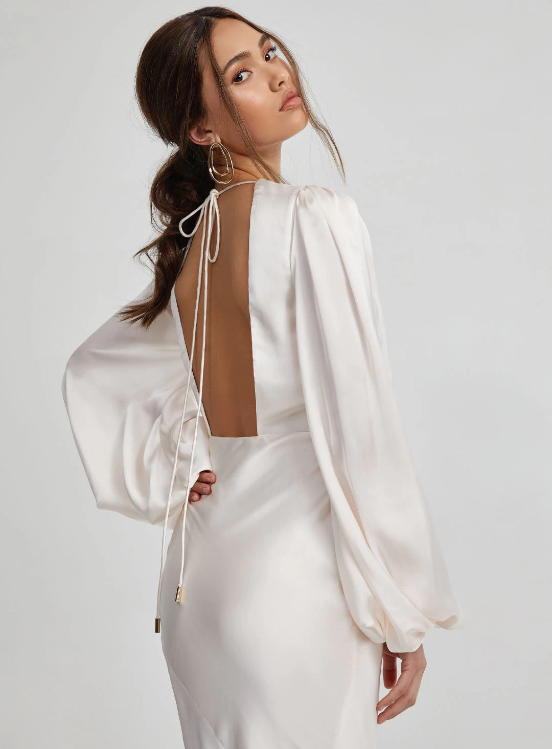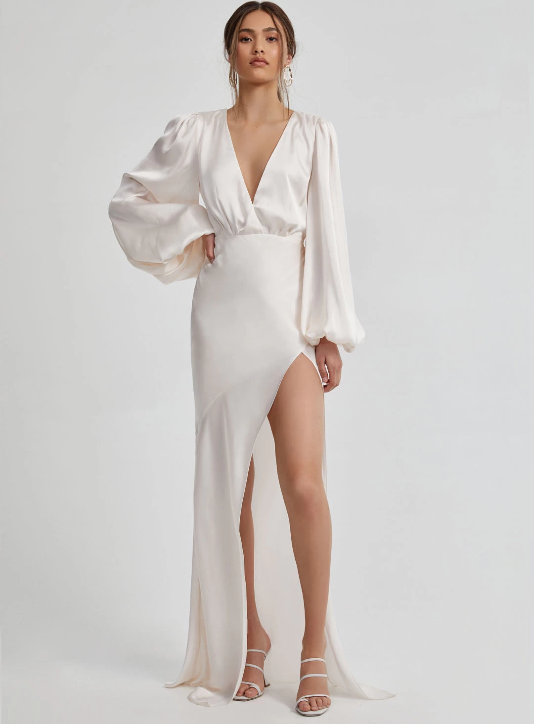 The Lexi India dress is a gorgeous full-length dress by Lexi clothing. Cut from a lightweight silky fabric with a signature Lexi thigh-high split. Features billowing sleeves and open back design.